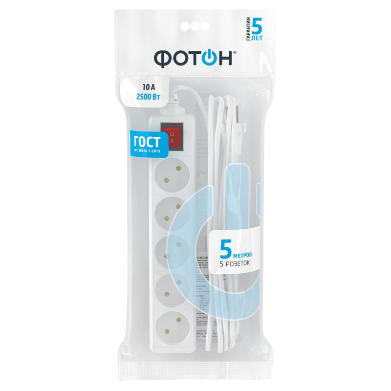 Удлинитель сетевой ФОТОН 10-55S, 5м, 5 розеток, 10А, с выкл., Белый