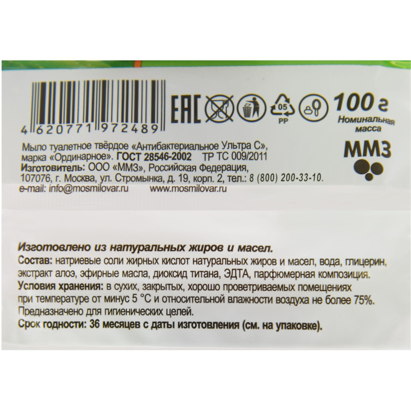 Мыло туалетное Ультра С антибактериальное 100 г. Назначение: Туалетное мыло прекрасно сочетает в себе хорошее моющее свойство с благотворным влиянием на кожу. Предназначено для мытья рук и тела. Глицерин, входящий в состав туалетного мыла, смягчает и увлажняет кожу. Изготовлено из натуральных жиров и масел. ГОСТ 28546-2002. Способ применения: нанести на влажную кожу, вспенить, затем смыть теплой водой. Меры предосторожности: при попадании в глаза или рот промыть их чистой водой. Состав: натриевые соли жирных кислот натуральных жиров и масел, вода, глицерин, экстракт алоэ, эфирные масла, диоксид титана, ЭДТА, парфюмерная композиция. Условия хранения: в сухих, закрытых, хорошо проветриваемых помещениях при температуре не ниже минус 5 С и относительной влажности воздуха не более 75 %. Срок годности: 36 месяцев.