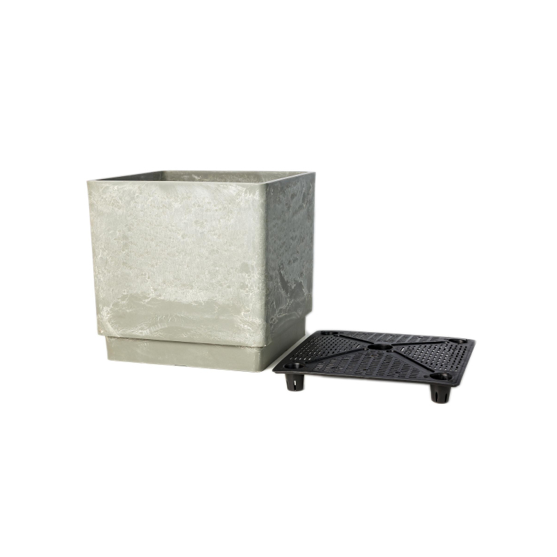 Квадратное кашпо для цветов с дренажным вкладышем, для цветов и растений современного дизайна, с оригинальной текстурой "под камень" в светло-сером цвете. Дренажный вкладыш позволяет регулировать воду в нем, между горшком и вкладышем есть пространство для воды, которая используется растениями при необходимости и позволяет сохранять влагу. Кашпо изготовлено из специализированного ЭКО пластика, в состав которого входит битый камень, древесная мука с полимерами, из-за свойств состава материала, кашпо дышащее как керамика. Материал ударопрочный, не боится мороза и на солнце не выгорает Материал: битый камень, древесная мука. полимеры. Цвет: серый. Общий объем горшка - 7 л. Длинна - 200 мм, высота - 200 мм, ширина - 200 мм.
