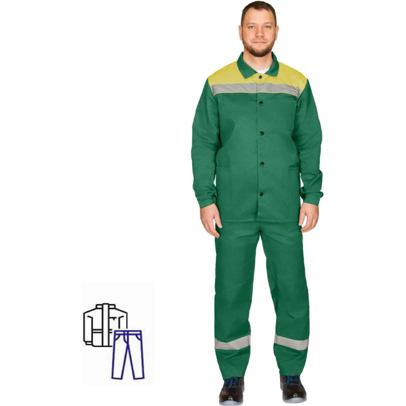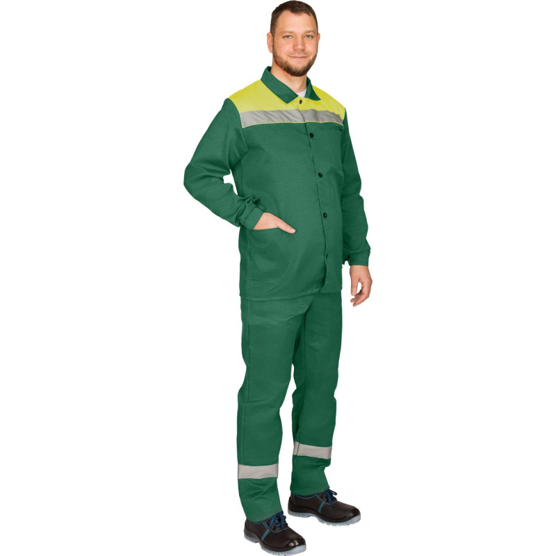 Костюм рабочий летний мужской л16-КБР с СОП зеленый/желтый (размер 60-62, рост 170-176). Костюм выполнен из смесовой ткани: 80% полиэстер, 20% хлопок. Плотность материала: 190 г/кв.м. Куртка удлиненная, прямой силуэт с 2 боковыми и 1 нагрудным накладными карманами. Брюки с застежкой гульфика на пуговицы, 2 накладных кармана. Куртка и брюки оснащены светоотражающей полосой. Сферы применения: сельское хозяйство, логистика, легкая промышленность, строительство, озеленение. Соответствует стандартам: ГОСТ 12.4.280-2014, ТР ТС 019/2011.