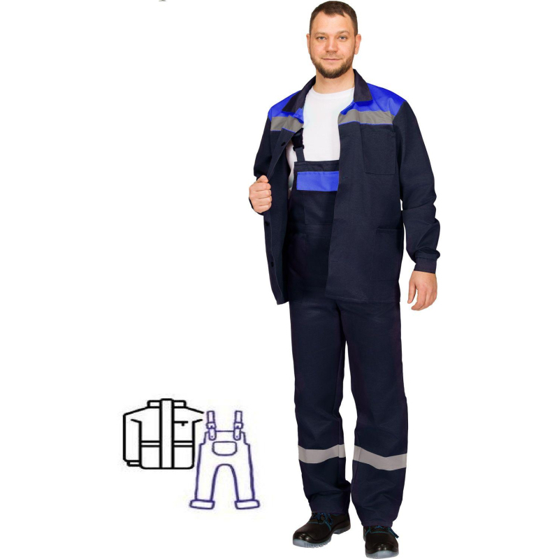 Костюм рабочий летний мужской л16-КПК с СОП синий/васильковый (размер 56-58, рост 194-200) состоит из куртки и полукомбинезона. Изготовлен из смесовой ткани (20% хлопок, 80% полиэфир, плотность 210 г/кв.м.), с водоотталкивающей пропиткой. Куртка и полукомбинезон оснащены светоотражающей полосой. Полукомбинезон c накладными карманами, гульфиком на пуговицах, эластичной тесьмой по талии спинки и регулируемыми бретелями. Куртка прямого силуэта c объемными накладными карманами и супатнoй застежкой на пуговицы. ГОСТ 12.4.280-2014, ТР ТС 019/2011. Сферы применения: сельское хозяйство, логистика, легкая промышленность, строительство, озеленение. Коллекция спецодежды л16 представлена комплектами куртка-брюки л16-КБР и куртка-полукомбинезон л16-КПК. Относится к сегменту ?Эконом?. Соответствует базовым характеристикам, заявленному ГОСТ и ТР ТС. Длительность эксплуатации СИЗ зависит от правильного ношения, хранения, условий работы и норм выдачи, установленных в организации и на предприятии.