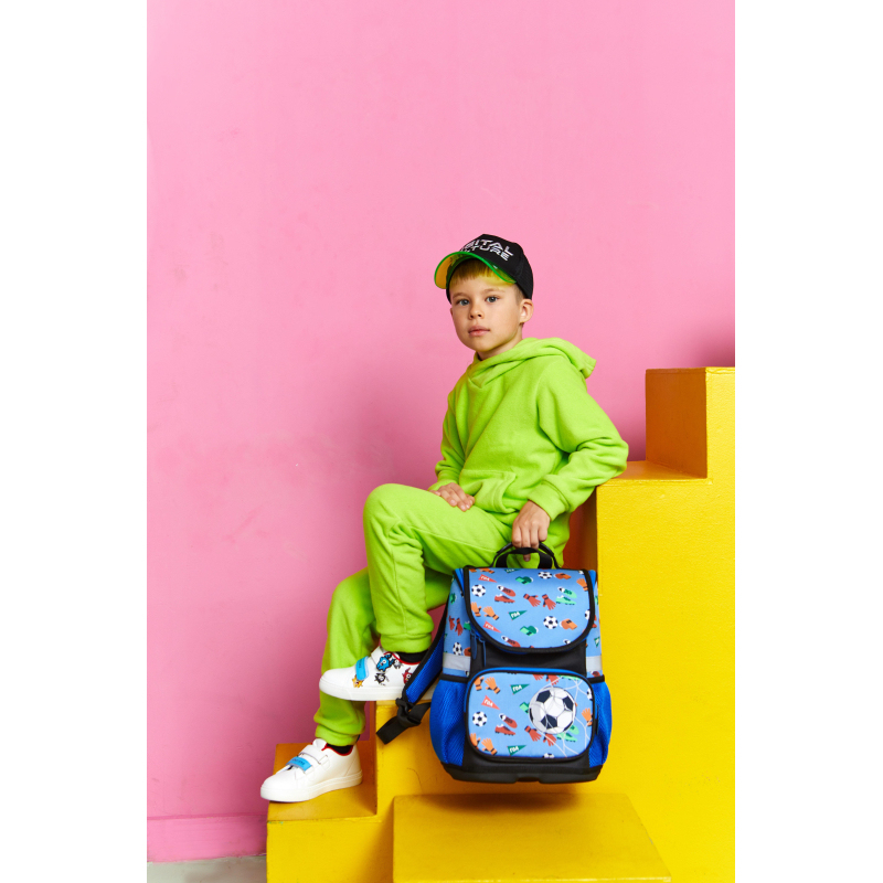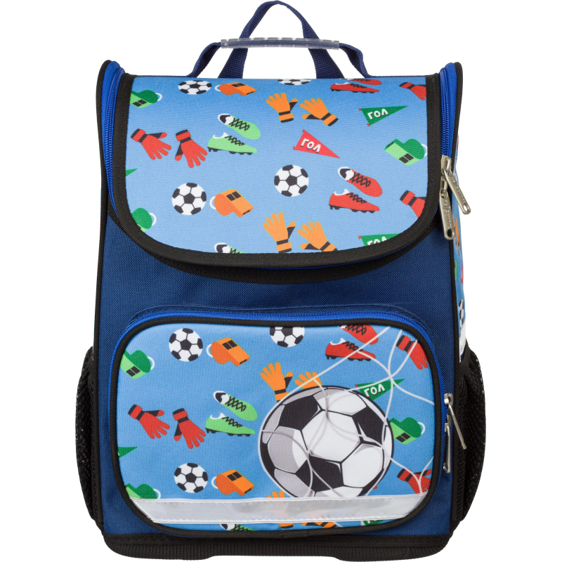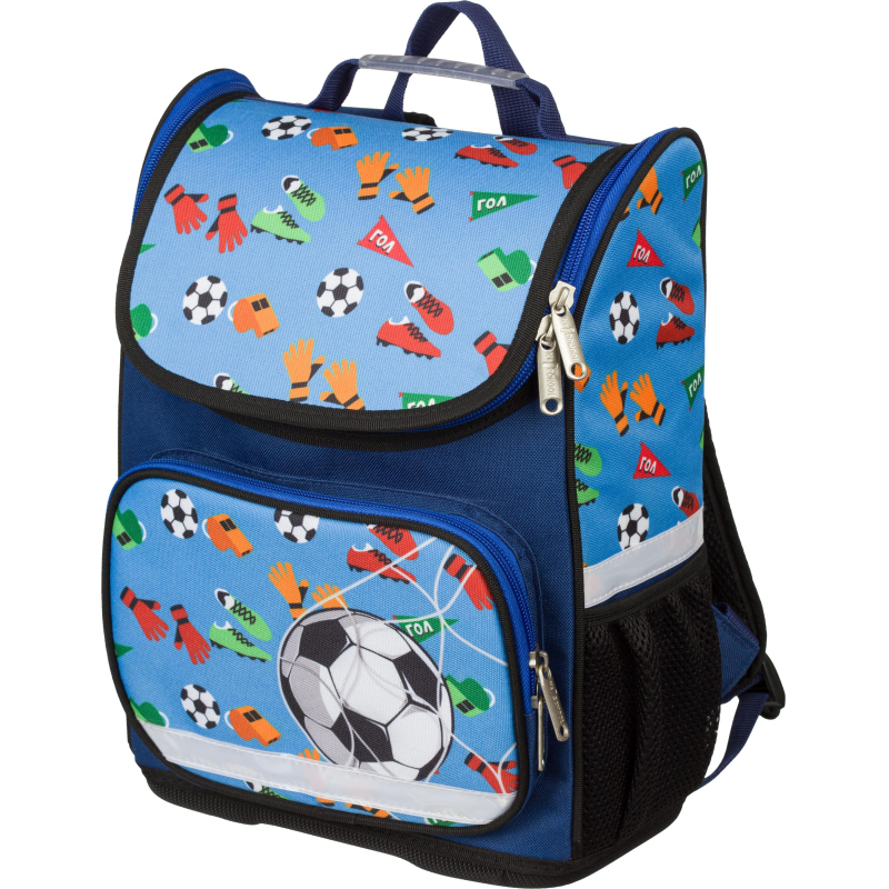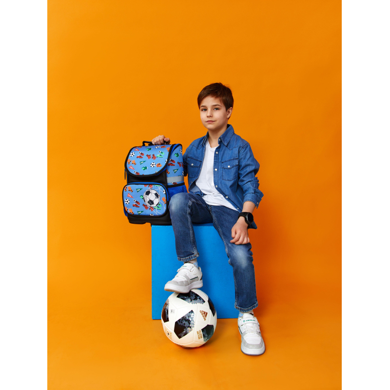 Ранец для мальчика эргономичной компактной формы. Жесткий каркас. Особенность данной модели - минимальный вес - 575 г. Ранец выполнен из полиэстера. Широкие удобные лямки из воздухообменного сетчатого материала регулируются по длине. Боковые карманы-сеточки для бутылки и прочих аксессуаров. Плотное дно удерживает форму. Благодаря устойчивому дну и ножкам ребенку будет удобно находить нужные учебники и тетради. Для безопасности ребенка в темное время суток предусмотрены светоотражатели на лямках и на боковых карманах. Размер: 350x270x150 мм. Дизайн представлен в спортивной тематике - футбол.
