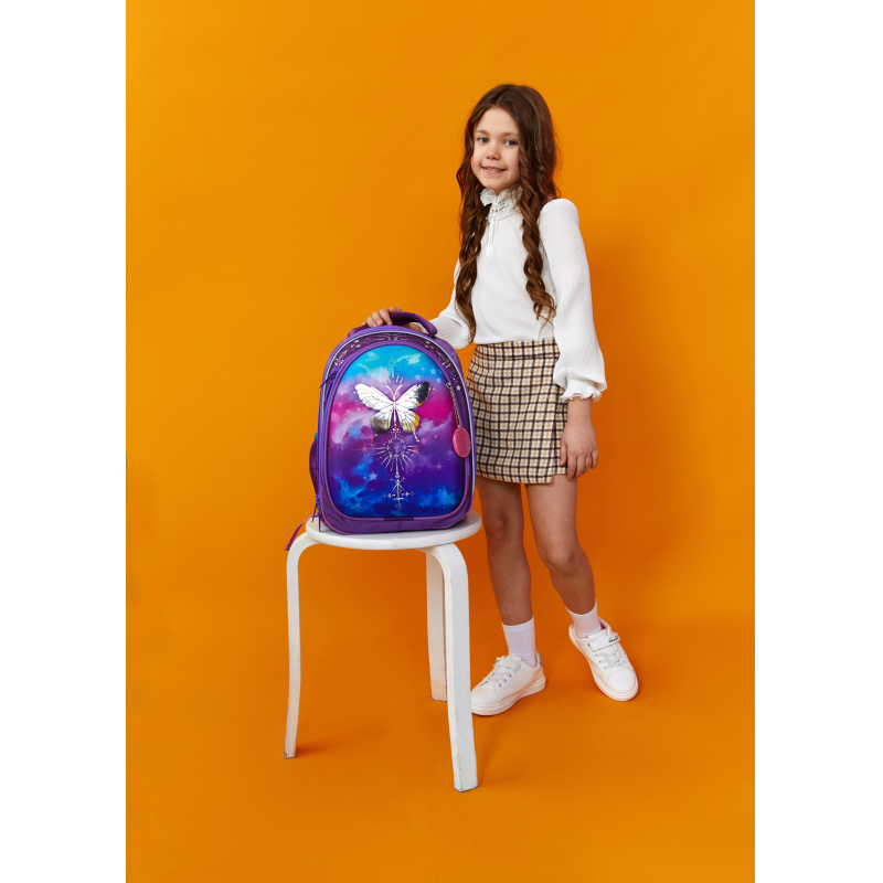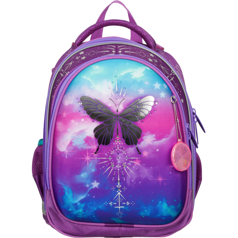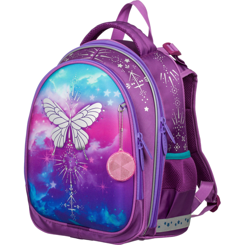 Ранец для девочки анатомический. Компактная обтекаемая форма. Ранец выполнен из полиэстера. Жесткий каркас, анатомическая спинка. Благодаря устойчивому дну и ножкам ребенку будет удобно находить нужные учебники и тетради. Боковые карманы с сеточкой подходят для переноски маленькой бутылочки с водой и прочих небольших аксессуаров. Широкие удобные лямки из воздухообменного сетчатого материала регулируются по длине и по спинке рюкзака - удобно подогнать под рост ребенка. Плотное дно удерживает форму. Грудная застежка помогает лучше зафиксировать ранец на теле и снять часть нагрузки с плеч. Для дополнительной безопасности ребенка в темное время суток светоотражатели на передней части ранца, на лямках и на боковых карманах. Особенности: декоративная аппликация фольгой, стразами. Ранец поставляется в комплекте с брелоком. Размер: 370x270x190 мм.