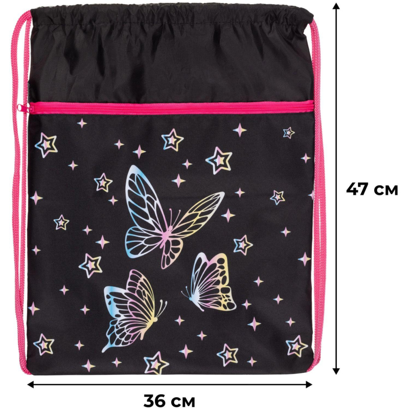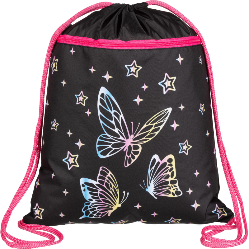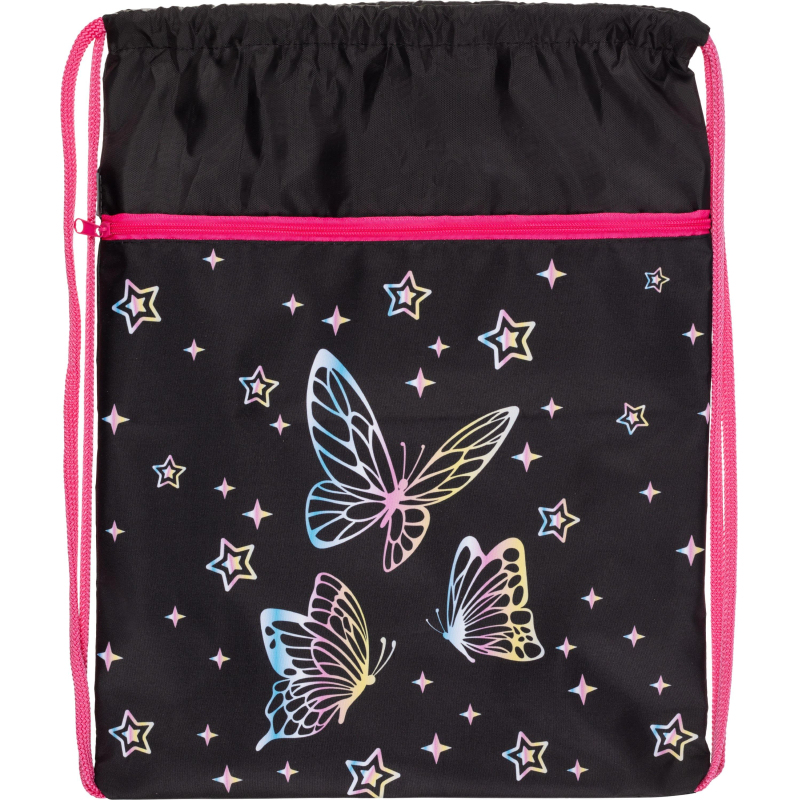 Мешок для обуви Комус Класс Галографик Батерфляй - вместительная и удобная в использовании емкость для хранения и переноса обувных изделий. Мешок размером 360х470 мм сделан из полиэстера и имеет два просторных отделения. Его дизайн выполнен в черном цвете с изображением бабочек. Мешок предназначается для девочек. В нем удобно и практично переносить сменную обувь в учебные заведения или спортивные секции. Мешок надевается на спину с помощью двух наплечных лямок, комфортно ощущается и не занимает много пространства. Не включает элементы светоотражения.
