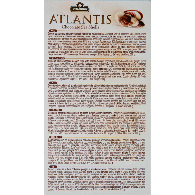 Для любителей шоколадных морских ракушек предлагаем новинку рынка: морские ракушки Atlantis из белого и темного шоколада! Удобная упаковка: каждая конфета в индивидуальной обертке. Подарите себе и своим близким настоящее шоколадное насладение! Ракушки Atlantis нежно тают во рту, раскрывая вкуснейшую начинку из орехового крема, влюбляя в себя обладателя все больше. Вес 200 г. Состав конфет: шоколад белый 50% (сахар, какао-масло, цельное сухое молоко, сухая молочная сыворотка, эмульгатор: соевый лецитин, ароматизатор идентичный натуральному: ванилин), ореховый крем 44% (сахар, растительный жир пальмовый), лесной орех 12%, обезжиренное сухое молоко, какао-порошок, сухая молочная сыворотка, эмульгатор: соевый лецитин (Е322), ароматизатор идентичный натуральному: ванилин), шоколад 6% (сахар, какао-масса, какао-масло, эмульгатор: соевый лецитин, ароматизатор идентичный натуральному: ванилин). Пищевая ценность продукта на 100 г: белки - 8 г, жиры - 35 г, углеводы - 55 г. Энергетическая ценность: 567 ккал. Срок годности - 12 месяцев. Условия хранения: Хранить в сухом, прохладном свободном от запахов месте при температуре от 18 до 20 С. Производитель - ATLANTIS Страна производства - Македония.