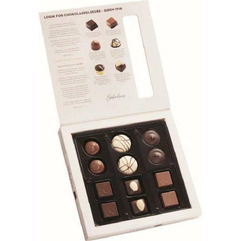 Ассорти шоколадных конфет. Состав: Темный шоколад с мятной начинкой Молочный шоколад с кремом тоффи Темный шоколад с миндалем и марципановой начинкой Молочный шоколад с нугой и орехами Белый шоколад с апельсиновым марципаном Темный шоколад с начинкой тоффи Состав: сахар, какао-масса, миндаль, какао-масло, сухое цельное молоко, сироп глюкозы, растительные жиры (масло ши, кокосовое масло, подсолнечное масло), лесной орех, сухое обезжиренное молоко, сухая молочная сыворотка, яблочное пюре, эмульгаторы (лецитин рапсовый, лецитин соевый, эфиры полиглицерина и взаимоэтерифицированных рициноловых кислот), глюкозно-фруктовый сироп, концентрат апельсина, сливочное масло, агент влагоудерживающий (глицерин), глюкоза, модифицированный кукурузный крахмал, соль, ароматизатор, консервант (сорбат калия), регуляторы кислотности (лимонная кислота, цитрат натрия), загустители (каррагинан, каррагинан из водорослей EUCHEMA, кукурузный крахмал), стабилизаторы (инвертаза, cорбитан тристеарат), агент желирующий (пектины), красители (каротины). Содержит молоко, сою, орехи (фундук, миндаль). Может содержать незначительное количество орехов (грецкий орех, фисташки), пшеницы и солода. Продукт не содержит ГМО. Общее содержание в темном шоколаде сухого остатка какао - минимум 50%. Общее содержание в молочном шоколаде сухого остатка какао - минимум 25%. Пищевая ценность: белки - 6,1 г, жиры - 26 г, углеводы - 54 г. Энергетическая ценность: 408 ккал. Срок годности: 10 месяцев. Вес: 140 г. Условия хранения: хранить в сухом, прохладном, свободном от запахов месте при температуре от 12 до 16 С и относительной влажности 75%. Страна производства: Польша.
