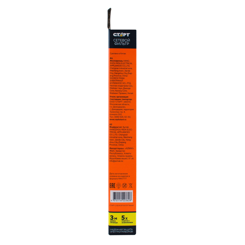 Сетевой фильтр Старт на 5 розеток 3 метра белый Внешний вид и/или характеристики товара могут быть изменены производителем в соответствии с производственным процессом.
