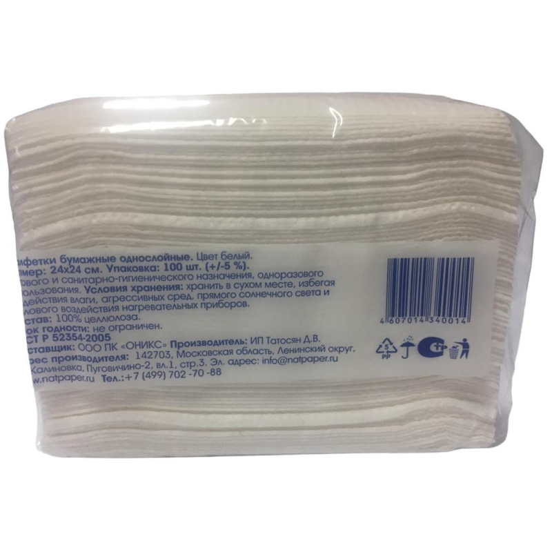 Салфетки бумажные Элементари 24x24 см белые 1-слойные 100 штук в упаковке Бумажные салфетки бытового и санитарно-гигиенического назначения для одноразового использования изготовлены из 100% целлюлозы. Салфетки белого цвета с тиснением. Упакованы в пластиковую пленку. Размеры в развернутом виде: 24х24 см.