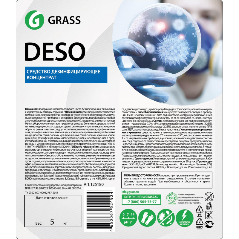 Дезинфицирующее средство Grass Deso 125180 5 кг (концентрат). Прозрачная жидкость голубого цвета, без посторонних включений, с характерным запахом отдушки. Назначение: дезинфекция поверхностей в помещениях, жесткой мебели, санитарно-технического оборудования, наружных поверхностей приборов и аппаратов, биотуалетов, посуды лабораторной, аптечной (включая однократного использования), предметов для мытья посуды, белья, уборочного инвентаря, предметов ухода за больными, средств личной гигиены, медицинских отходов, игрушек, резиновых и пропиленовых ковриков, обуви из резин, пластмасс и других полимерных материалов; профилактическая дезинфекция систем вентиляции и кондиционирования воздуха (бытовые кондиционеры, сплит-системы, мультизональные сплит-системы, крышные кондиционеры); дезинфекция, в том числе совмещенная и не совмещенная с предстерилизационной очисткой, медицинских изделий из различных материалов ручным и механизированным способами в ультразвуковых установках УЗВ-10 / 150-ТН-"РЭЛТЕК" и "Elmason". Способ применения: концентрат разводится с водой в пропорции 1:500-1:25 или 2-40 мл на 1 литр воды согласно инструкции по применению средства дезинфицирующего "Deso" № 01 / 16 от 21 июля 2016 г. Состав: 30% вода очищенная; полигексаметиленгуанидин гидрохлорид -7,7%;