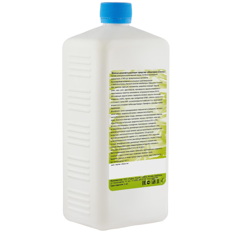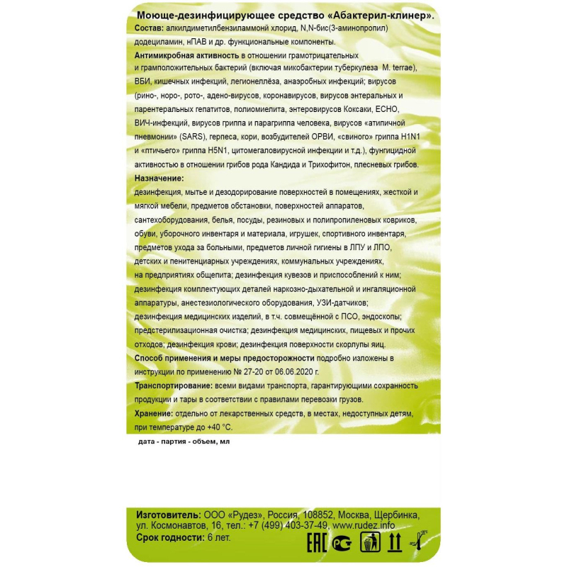 Средство "Абактерил-клинер" обладает антибактериальной активностью в отношении: грамотрицательных и грамположительных бактерий (включая микобактерии туберкулеза - тестировано на Mycobacterium terrae), возбудителей внутрибольничных инфекций (ВБИ) - тестировано на Pseudomonas aeruginosa, кишечных инфекций - бактерий группы кишечной палочки, стафилококков, стрептококков, в т.ч. метициллин-резистентный стафилококк и ванкомицин-резистентный энтерококк, сальмонелл, легионеллеза, анаэробных инфекций; вирусов (рино-, норо-, рото-, адено-вирусов, коронавирусов, вирусов энтеральных и парентеральных гепатитов (в т.ч. гепатита А, В, С), полиомиелита, энтеровирусов Коксаки, ЕСНО, ВИЧ-инфекций, вирусов гриппа и парагриппа человека, вирусов "атипичной пневмонии" (SARS), вирусов герпеса, кори, возбудителей ОРВИ, вирусов "свиного" гриппа H1N1 и "птичьего" гриппа H5N1, цитомегаловирусной инфекции и т.д.), фунгицидной активностью в отношении грибов рода Кандида и Трихофитон, плесневых грибов (тестировано на тест-штамме Aspergillus niger). Преимущества: средство имеет хорошие моющие (что позволяет совмещать дезинфекцию и очистку) и дезодорирующие свойства, уничтожает пятна и налеты жира, масла, сажи, белковых отложений и многие другие трудноудаляемые загрязнения с поверхностей из любых материалов (стекло, зеркала, металлы, керамика, ковры, кожа, хромированные изделия, бетон, кафель, резина, пластик, винил, фарфор, фаянс и др., в том числе пористые), удаляет с поверхностей биологические пленки, не портит обрабатываемые объекты, не обесцвечивает ткани, не фиксирует органические загрязнения, не вызывает коррозии металлов, включая нелегированные стали, сплавы цветных металлов (латунь, медь), титановые и алюминиевые сплавы, средство несовместимо с мылами и анионными поверхностно-активными веществами, средство полностью биоразлагаемо и экологически безопасно, средство сохраняет свои свойства после замерзания и последующего оттаивания, рабочие растворы негорючие, пожаро- и взрывобезопасны, безопасно для окружающей среды, не фиксирует органические соединения, смывание рабочего раствора средства с обработанных поверхностей после дезинфекции не требуется. Хранение: в герметично закрытых оригинальных емкостях производителя, в сухих чистых, хорошо вентилируемых темных складских помещениях, вдали от нагревательных приборов и открытого огня, отдельно от лекарственных средств, в местах недоступных для посторонних лиц, детей и животных при температуре до +40°С. Токсичность и безопасность: по параметрам острой токсичности по ГОСТ 12.1.007-76 относится к 3 классу умеренно опасных веществ при введении в желудок (по параметрам острой токсичности DL50), к 4 классу малоопасных веществ при нанесении на кожу, при ингаляционном воздействии в виде паров по степени летучести (С20) средство также мало опасно. Средство относится к 4 классу малотоксичных веществ при введении в брюшину согласно классификации К.К. Сидорова. Средство оказывает умеренное раздражающее действие при контакте с кожей и выраженное раздражающее действие на слизистые оболочки глаза. Средство не оказывает кожно-резорбтивного и сенсибилизирующего действия.