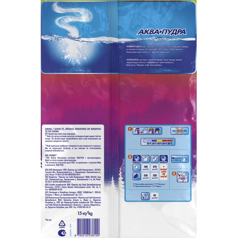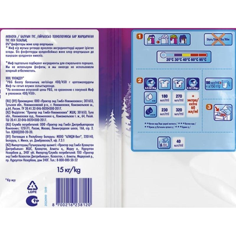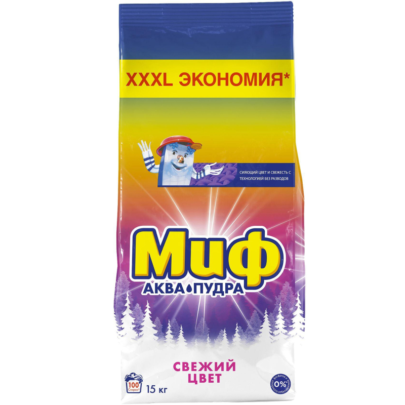 Порошок стиральный автомат Миф Аква Пудра Свежий цвет 15 кг. Назначение: Стиральный порошок Миф Свежий цвет Автомат для стиральных машин предназначен для стирки цветного и белого белья. Порошок для стирки Миф Свежий цвет отлично очищает и удаляет пятна, сохраняет яркие цвета и придает вещам приятный свежий аромат. Благодаря технологии Аквапудра, Миф Свежий цвет мгновенно растворяется при контакте с водой и хорошо выполаскивается. Выгодный размер упаковки 15 кг позволяет сэкономить на каждой стирке по сравнению с покупкой маленькой упаковки. Только сияющая чистота и свежесть. Преимущества порошка Миф Свежий цвет: Удаляет пятна; Придает аромат свежести и чистоты; Сохраняет яркость цвета; С технологией против разводов; Не содержит фосфаты и хлорный отбеливатель; Все активные компоненты полностью биоразлагаемы. Способ применения: для достижения наилучших результатов используйте 150 г стирального порошка на 1 загрузку белья (до 5 кг). Меры предосторожности: беречь от детей, избегать попадания в глаза, при попадании в глаза - немедленно промыть проточной водой, не глотать, при проглатывании обратитесь за медицинской помощью, хранить вдали от пищевых продуктов, при повышенной чувствительности и повреждениях кожи избегать длительного контакта с любыми средствами для стирки. Состав: 5-15% анионные пав; < 5% неионогенные пав, поликарбоксилаты, цеолиты; энзимы, ароматизирующие добавки. Условия хранения: предохранять от воздействия прямых солнечных лучей и нагревания выше 35°с. хранить при относительной влажности воздуха не более 95%. Срок годности: 24 месяца.