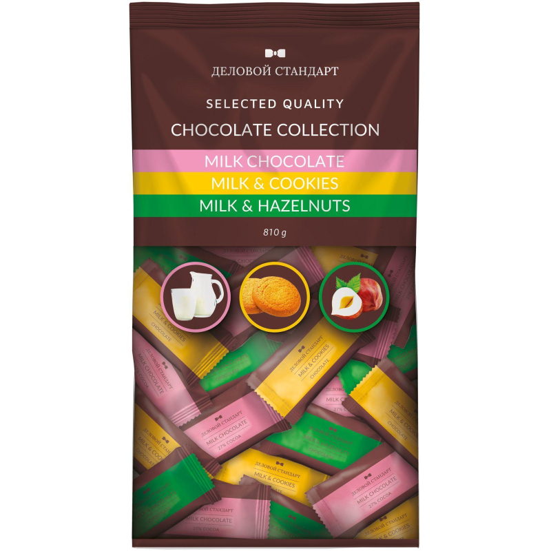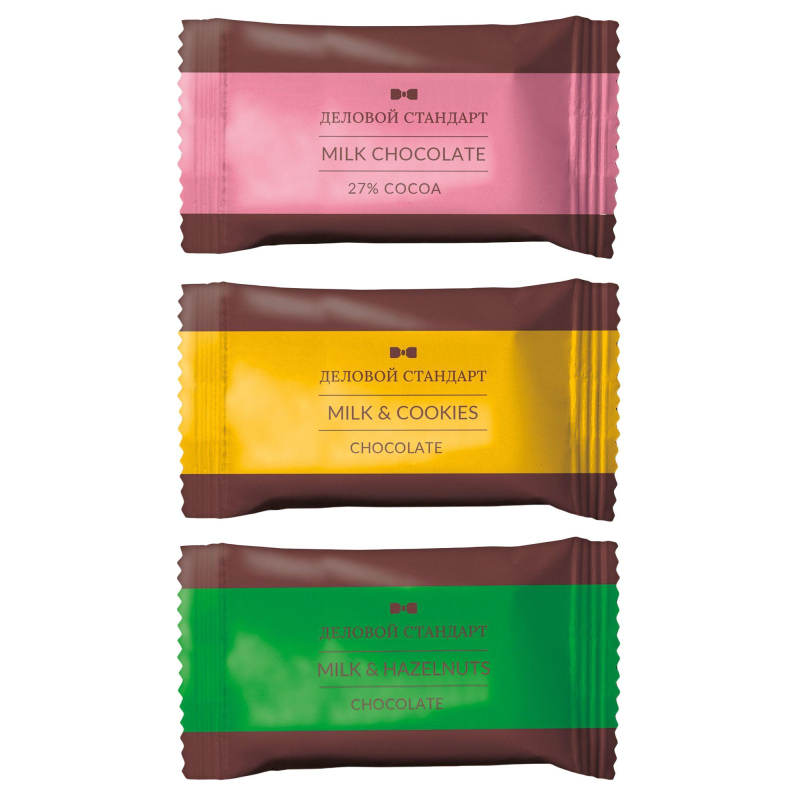 Порционный шоколад Деловой Стандарт ассорти - вкусный десерт в удобной индивидуальной упаковке. Сразу три любимых и популярных вкуса - классический молочный шоколад, молочный шоколад с фундуком, молочный шоколад с печеньем. Шоколад Деловой Стандарт превосходно сочетается с чашечкой бодрящего кофе или чая, подчеркивая их яркий вкус и приятную терпкость. Размер и вес одной плитки идеально подойдет для переговорных комнат современных компаний, а также станет прекрасным угощением для гостей и клиентов в шоу-рум, на ресепшен, выставках и презентациях. Вес: 810 г. Молочный шоколад: Состав: сахар, масло какао, какао тертое, молоко сухое цельное, сухая молочная сыворотка, молочный жир, эмульгаторы: соевый лецитин, Е476; ароматизатор ванилин. Может содержать незначительное количество орехов (фундука, миндаля, грецкого ореха, кешью, пекана, фисташки), пшеничного глютена и яичных продуктов. Пищевая ценность на 100 г продукта: белки - 4,8 г, жиры - 29,2 г, в т. ч. насыщенных жирных кислот 17,4 г, трансизомеров ненасыщенных жирных кислот 0,3 г, углеводы - 60,5 г. Энергетическая ценность: 524 ккал/2191 кДж. Молочный шоколад с фундуком: Состав: молочная шоколадная масса (сахар, масло какао, какао тертое, молоко сухое цельное, сыворотка молочная сухая, молочный жир, эмульгаторы: соевый лецитин, Е476, ароматизатор ванилин), ядра фундука обжаренные дробленые. Может содержать незначительное количество других орехов (миндаля, грецкого ореха, кешью, пекана, фисташки), арахиса, пшеничного глютена и яичных продуктов. Пищевая ценность на 100 г продукта: белки - 6,0г, жиры - 32,0г, в т. ч. насыщенных жирных кислот 15,8 г, трансизомеров ненасыщенных жирных кислот 0,3 г, углеводы - 57,0г. Энергетическая ценность: 540 ккал/2260 кДж. Молочный шоколад с печеньем: Состав: молочная шоколадная масса (сахар, масло какао, какао тертое, молоко сухое цельное, сыворотка молочная сухая, молочный жир, эмульгаторы: соевый лецитин, Е476, ароматизатор ванилин), печенье (сахар, мука пшеничная, ядро абрикосовой косточки, яичный белок, разрыхлители (карбонаты натрия, карбонаты аммония), ароматизаторы). Может содержать незначительное количество орехов (фундука, миндаля, грецкого ореха, кешью, пекана, фисташки) и арахиса. Пищевая ценность на 100 г продукта: белки - 5,0г, жиры - 28,0г, в т. ч. насыщенных жирных кислот 16,4 г, трансизомеров ненасыщенных жирных кислот 0,3 г, углеводы - 62,0г. Энергетическая ценность: 520 ккал/2175 кДж. Условия хранения: хранить при температуре от +5 до +22 °С и относительной влажности воздуха не более 75%. Беречь от воздействия прямого солнечного света. Срок годности: 12 месяцев. Страна производства: Россия.