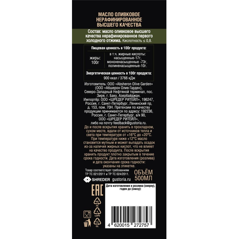 Масло оливковое нерафинированное высшего качества. Состав: масло оливковое высшего качества нерафинированное первого холодного отжима. Пищевая ценность в 100 г продукта: жиры - 100 г, в т.ч. жирные кислоты: насыщенные - 73 г, полинасыщенные - 10 г. Энергетическая ценность в 100 г продукта: 900 ккал/3766 кДж. Срок годности: 24 месяца. Условия хранения: до и после вскрытия хранить в сухом прохладном месте, вдали от источников тепла и света при температуре от +16 до +20 С. При температуре ниже +12С масло становится мутным и может выпадать осадок из-за наличия жирных кислот, что не влияет на качество продукта. После вскрытия хранить продукт плотно закрытым в течении срока годности. Объем: 0,5 л. Производитель: Absheron Olive Garden. Страна производства: Азербайджан.
