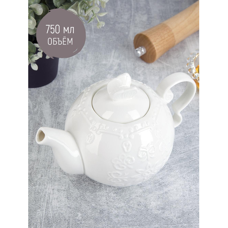 Чайник заварочный Nouvelle Home Маршмеллоу фарфоровый 750 мл. В основании носика чайника есть отверстие для задерживания чаинок. Комплектация: чайник - 1 шт. Рекомендации по использованию: ПММ - Да. Размер штуки: 19,5х11,5х12,5 см. Материал: фарфор. Рельефная поверхность. Товар поставляется без индивидуальной упаковки.