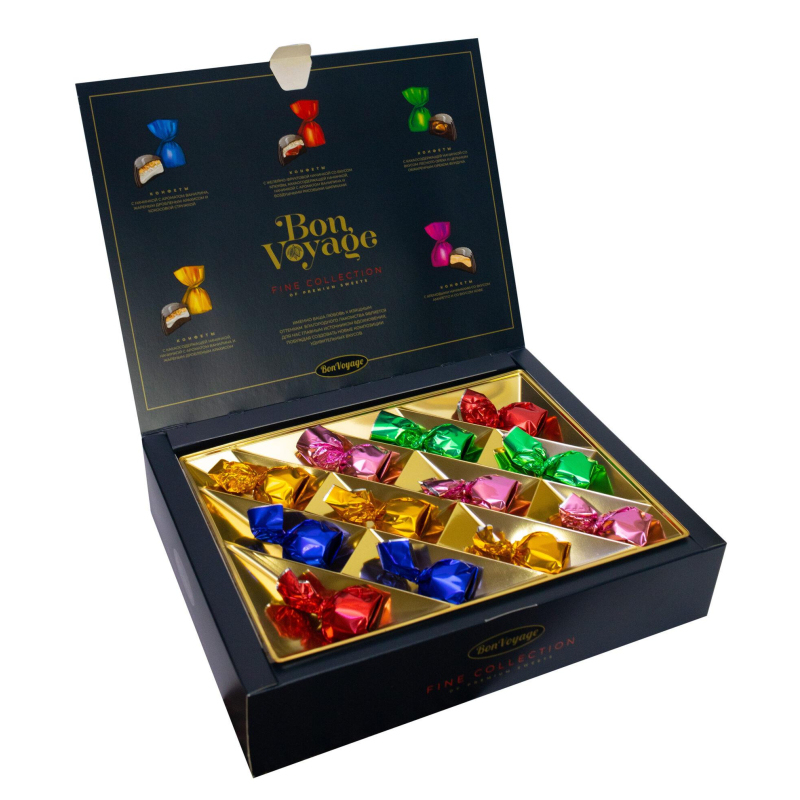 Конфеты Bon Voyage premium ассорти, изготовленные по уникальной рецептуре. Набор представлен в синей картонной коробке, коробка в сумке. Вес: 37 г. Состав: глазурь кондитерская (сахар белый, заменитель масла какао не темперируемый лауринового типа (пальмоядровое масло, эмульгаторы: Е492, Е322), какао-порошок, эмульгатор: Е322, ароматизатор Ванилин); сахар белый; пальмоядровое масло, ядро арахиса жареное дробленое; кокосовое масло; какао-порошок, мука соевая обезжиренная дезодорированная; сыворотка молочная сухая деминерализованная; эмульгатор: соевый лецитин; ароматизатор Ванилин; соль поваренная пищевая йодированная (йодат калия, агент антислеживающий Е536). Конфеты Магия топ: патока крахмальная; вода питьевая; ПЭК рис воздушный (мука (крупа) рисовая, мука пшеничная хлебопекарная, сахар, соль), пюре яблочное, желирующий агент: пектин яблочный, регуляторы кислотности, лимонная кислота, ароматизаторы: Ванилин, Клюква, комплексная пищевая добавка - краситель Хромовый красный (носитель Е1520, эмульгатор Е433, краситель Е120, эмульгатор Е322, краситель Е160с, стабилизатор Е415). Пищевая ценность на 100 г продукта: белки - 2.9 г, жиры - 29.8 г, углеводы - 60.4 г. Энергетическая ценность на 100 г продукта: 521 ккал. Срок годности: 9 месяцев. Условия хранения: хранить при температуре от 10 С до 21 С. Производитель: BonBons. Страна производства: Беларусь.