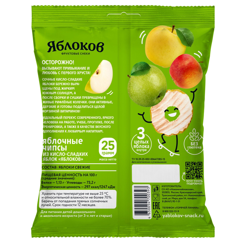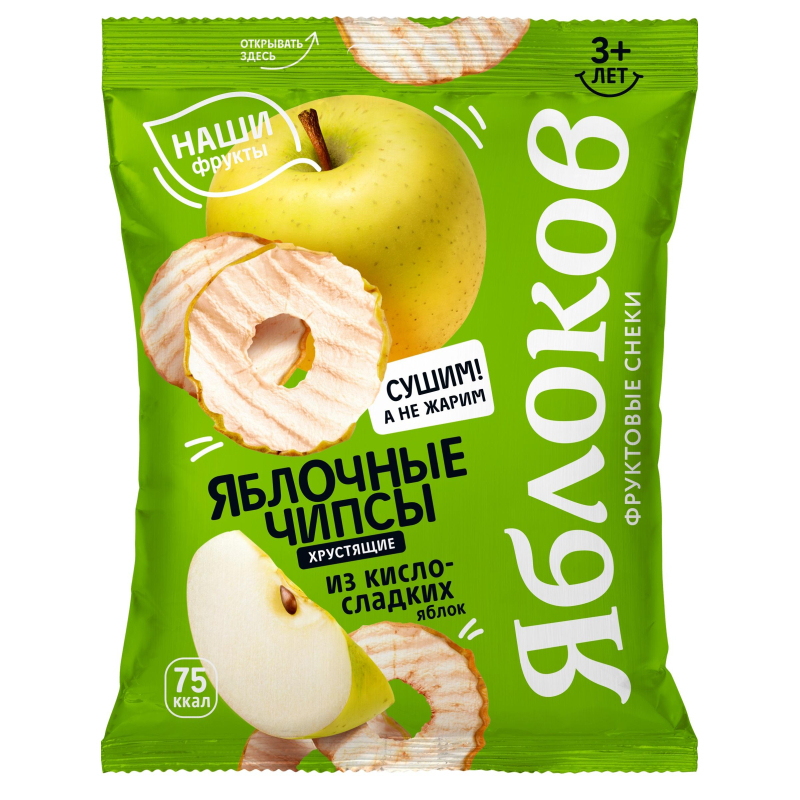 Чипсы Яблоков из кисло-сладких яблок 25 г. Осторожно, вызывают привыкание и любовь с первого хруста. Сочные сладкие яблоки бережно выращены под жарким южным солнцем, а после сборки и сушки превращены в живые рифленые колечки. Они активные, дерзкие и готовы поделиться целой корзиной витаминов. Идеальный перекус современного, яркого человека на работе, учебе, прогулке, после тренировки, а также в качестве вкусного дополнения к любимым напиткам.Состав: яблоки свежие. Пищевая ценность на 100 г (средние значения): 1.13 г, углеводы - 73.2 г. Энергетическая ценность - 297 ккал/1247 кДж. Хранить при температуре не выше 25 градусов С и относительной влажности не более 70%. Беречь от попадания прямых солнечных лучей.Срок годности 12 месяцев.