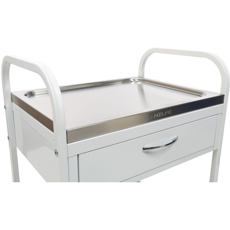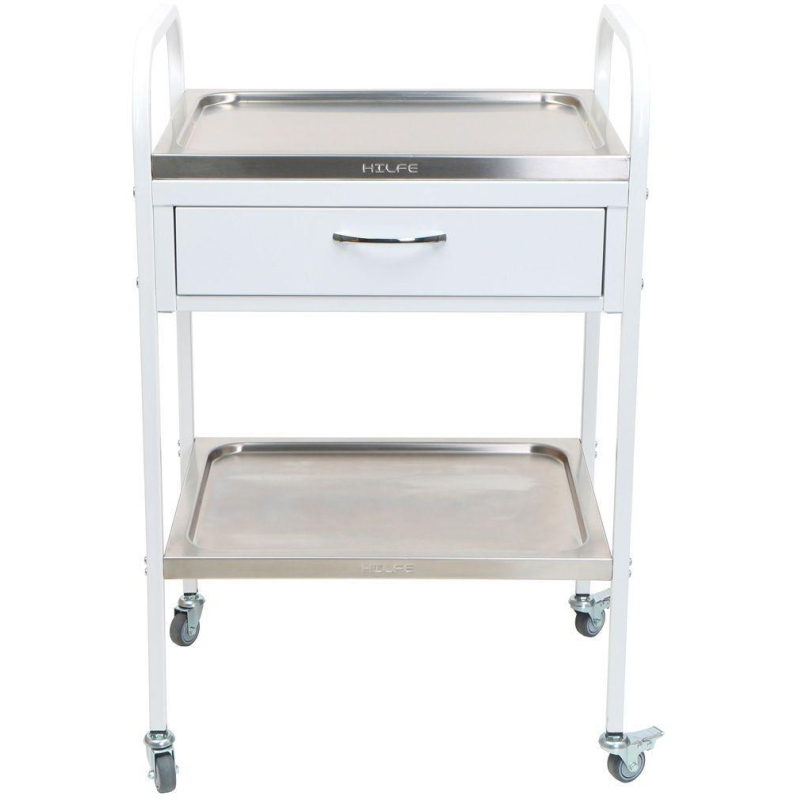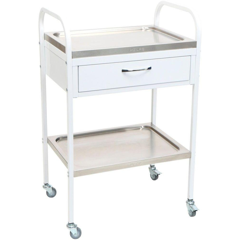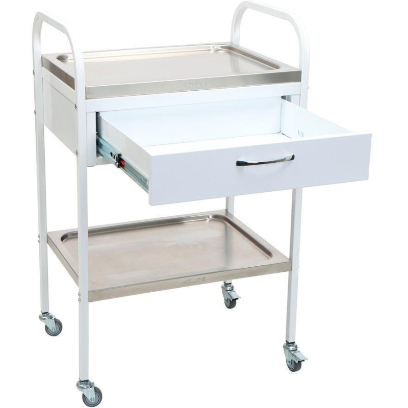 Стол манипуляционный медицинский предназначен для размещения инструмента, медикаментов и приборов. Каркас столика изготовлен из профильной трубы квадратного сечения 20х20х1.5 мм, покрытой эпоксидно-порошковой краской. Полка изготовлена из нержавеющей стали толщиной 0.8 мм. Ящик установлен на телескопические направляющие, которые обеспечивают свободный и плавный ход ящика даже при полной загрузке, позволяют выдвигать ящик на всю длину и использовать все пространство. На ящике установлена хромированная ручка. Поверхность столика устойчива к ударам, сколам, средствам дезинфекционной обработки способом протирания. Столик манипуляционный оснащен 4 колесами диаметром 50 мм из резины серого цвета, два из которых снабжены тормозом. Нагрузка на металлическую полку - не более 10 кг, на ящик - не более 15 кг. Изображения товаров на сайте не могут гарантировать точную цветопередачу.