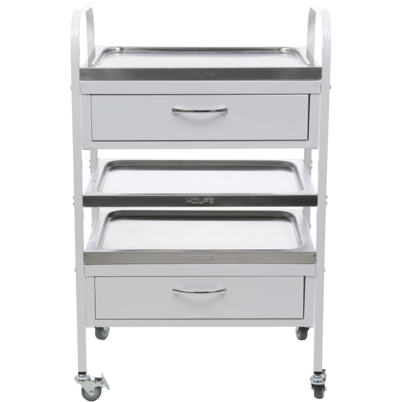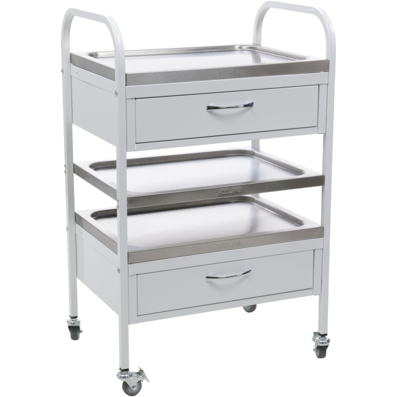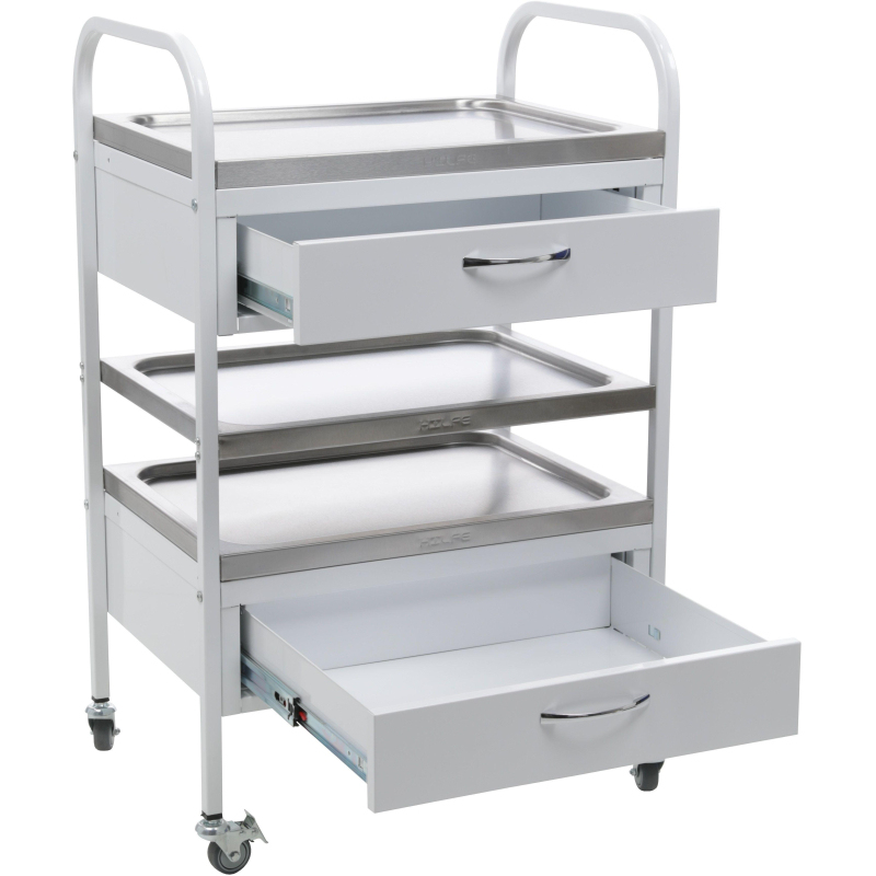 Стол манипуляционный медицинский предназначен для размещения инструмента, медикаментов и приборов. Каркас столика изготовлен из профильной трубы квадратного сечения 20х20х1.5 мм, покрытой эпоксидно-порошковой краской. Полка изготовлена из нержавеющей стали толщиной 0.8 мм. Ящик установлен на телескопические направляющие, которые обеспечивают свободный и плавный ход ящика даже при полной загрузке, позволяют выдвигать ящик на всю длину и использовать все пространство. На ящике установлена хромированная ручка. Поверхность столика устойчива к ударам, сколам, средствам дезинфекционной обработки, способом протирания. Столик манипуляционный оснащен 4 колесами диаметром 50 мм из резины серого цвета, два из которых снабжены тормозом. Нагрузка на металлическую полку - не более 10 кг, на ящик - не более 15 кг. Изображения товаров на сайте не могут гарантировать точную цветопередачу.