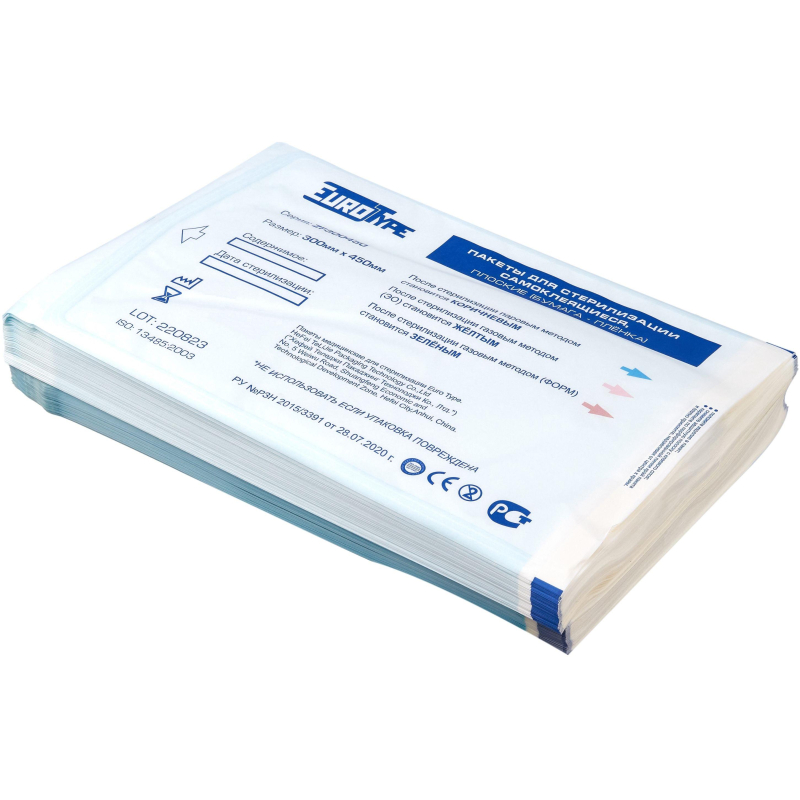 Пакет для стерилизации комбинированный EuroType для паровой/газовой стерилизации 300 x 450 мм самоклеящийся (200 штук в упаковке). Комбинированные пакеты изготовлены из: - непрозрачная сторона - медицинская бумага (60g/m2), на эту сторону наносится маркировка; - прозрачная сторона - прозрачная полимерная пленка (полиэстер = 12um + полипропилен=40um). Прозрачная и непрозрачная стороны соединены между собой термошвами, на которых нанесены цветные химические индикаторы в виде параллелепипедов для парового метода - индикатор голубого цвета, после стерилизации приобретает коричневый цвет; для газового метода с применением окиси этилена - индикатор розового цвета, после стерилизации приобретает желтый цвет; для газового метода с применением формальдегида - индикатор желтого цвета, после стерилизации приобретает зеленый цвет.