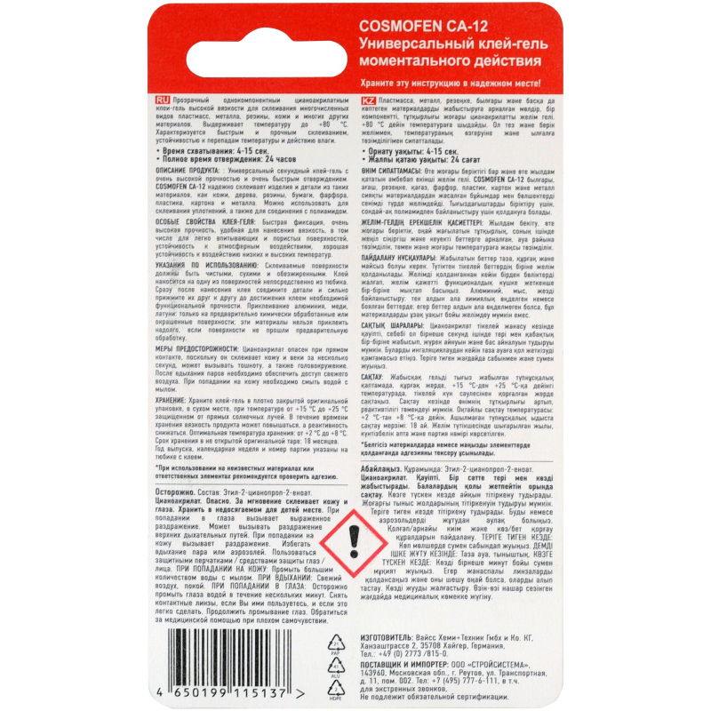 Прозрачный однокомпонентный цианоакрилатный клей-гель средней вязкости с очень высокой прочностью и очень быстрым отверждением. Применяется для склеивания всех видов пластмасс, металла, резины, кожи и многих других материалов. Выдерживает температуру до +110 °С. Характеризуется быстрым и прочным склеиванием, устойчивостью к перепадам температуры и действию влаги. Надежно склеивает изделия и детали из таких материалов, как кожи, дерева, резины, бумаги, фарфора, пластика, картона и металла. Можно использовать для склеивания силиконовых уплотнений и уплотнений из термоэластопластов (ТРЕ), а также для соединения с полиамидом, полиэтиленом и полиолефинами. Не стикает с вертикальных поверхностей. Срок хранения 18 мес.