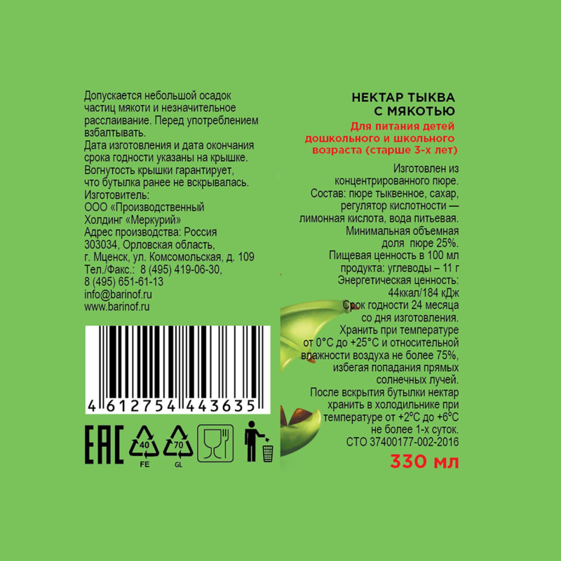 Нектар "Динозаврик Ди" тыква с мякотью 0.33 л (10 штук в упаковке). Нектар состоит из натуральных ингредиентов: тыквенное пюре, сахар, регулятор кислотности - лимонная кислота и вода питьевая. Нектар предназначен для детей от 3-х лет. Пищевая ценность в 100 мл продукта: углеводы - 11 г. Энергетическая ценность: 44 ккал/184 кДж. Срок годности: 24 месяца со дня изготовления. Хранить при температуре от 0 до +25 °С и относительной влажности воздуха не более 75%. После вскрытия хранить в холодильнике при температуре от +2 до +6 °C не более суток.