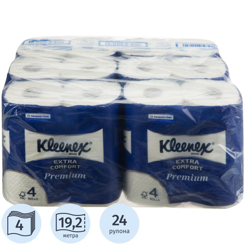 Бумага туалетная Kimberly-Clark Kleenex Premium Extra Comfort 4-слойная белая (24 рулона в упаковке) Белая, четырехслойная с тиснением и перфорацией изготовлена из 100% первичного волокна, обеспечивает мягкость и комфорт при использовании. Рулонная туалетная бумага Kimberly-Clark Kleenex Premium Extra Comfort имеет сертификат FSC и распадается в воде на мелкие фракции, что гарантирует соблюдение высоких экологических стандартов. В рулоне 160 листов размером 12x9.8 см. Размеры: длина рулона 19.2 м, ширина рулона 12.2 см, диаметр втулки 4.4 см.
