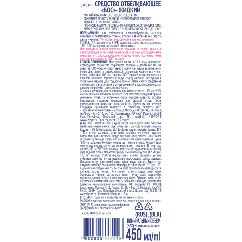 Отбеливатель Бос плюс жидкость 450 мл Назначение. Средство предназначено для отбеливания хлопчатобумажных, льняных, смесовых, синтетических тканей а также для отбеливания шерсти, шелка и кружев. Способ применения. При ручной стирке в 10 л воды растворяют необходимое количество стирального порошка и добавляют 100 мл средства Бос-жидкий сразу перед стиркой или перед замачиванием белья. При стирке в автоматической стиральной машине (на 4-5 кг белья) добавляют 100 мл средства Бос-жидкий непосредственно в барабан, засыпают порошок и ведут стирку согласно инструкции к стиральной машине. Для трудновыводимых пятен налить средство на пятно и приступить к стирке. В случае сомнений в устойчивости окраски изделия попробуйте на незаметной части. Меры предосторожности. Хранить вдали от пищевых продуктов. Хранить в недоступном для детей месте. При попадании средства в глаза немедленно промыть проточной водой. Тщательно мойте руки после применения средства. При повышенной чувствительности и повреждениях кожи избегать длительного контакта с любыми средствами для стирки. Использовать по способу применения, указанному на этикетке. Состав: