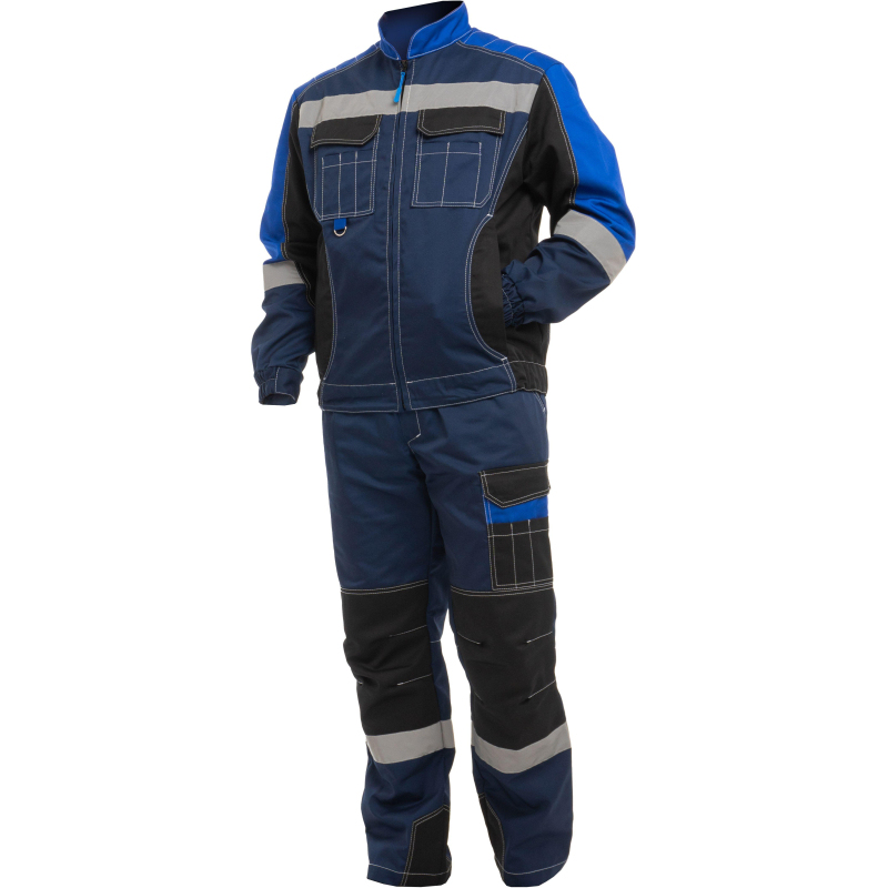 Костюм рабочий летний Формула Коттон с СОП синий/васильковый (размер 64-66, рост 170-176). Костюм подойдет как для мужчин, так и для женщин. Костюм из смесовой ткани с масловодоотталкивающей отделкой, малоусадочной, дышащей, износостойкой. Состав ткани: 60% хлопок, 40% полиэстер. Плотность материала 235 г/кв.м. Костюм с контрастной отсрочкой, с застежкой на закрытую молнию. Молния пластиковая, повышенной прочности, с металлическим бегунком, ?мелкий зуб?, цвет ?серебро?. Нагрудные карманы, комбинированные с делением для мелких предметов, под карманом петля для крепления бейджа. Нижние боковые карманы вертикальные в рельефных швах на молнии. На куртке расположены внутренние объемные карманы. Регулировка по низу куртки хлястиками на резинке и пуговице. Рукава с манжетами с вставками эластичной тесьмы. Полукомбинезон с шестью функциональными карманами, с поясом и шлевками с вставками, эластичной резинкой. Застежка - гульфика на молнию. Наколенники объемные с вытачками с подрезом под коленом, что исключает излишние заломы ткани. С усилениями по шаговым швам полукомбинезона. Элементы повышенной видимости - световозвращающая лента шириной 50 мм (400 кд). Изделия из этой ткани подходят для стирки и химчистки на профессиональном оборудовании, что подтверждено протоколом испытаний. Соответствует стандарту ТР ТС 019/2011. Костюм подходит для таких отраслей как: ЖКХ, легкая промышленность, логистика, охранная деятельность, сельское хозяйство, строительство, электронная промышленность, фармацевтика, ИТР, автомобильная, пищевая промышленность, тяжелая промышленность.