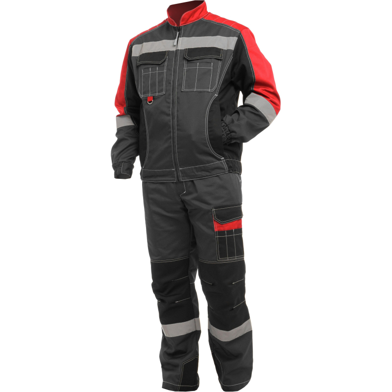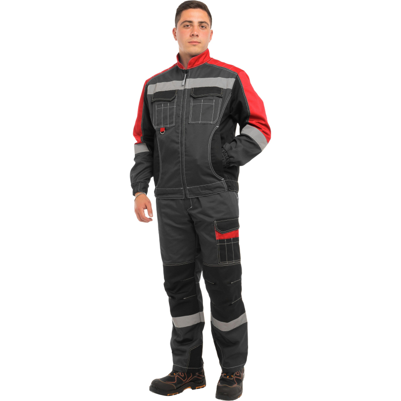?Костюм рабочий летний ??"??Формула Коттон??"?? с СОП серый/красный (размер ??56-58??, рост 1??82-??1??88??). Костюм подойдет как для мужчин, так и для женщин.? ?Костюм из смесовой ткани с масловодоотталкивающей отделкой. Состав ткани: 60% хлопок, 40% полиэстер. Плотность материала 235 г/кв.м.? ?Костюм с контрастной отсрочкой, с застежкой на закрытую молнию. Молния пластиковая, повышенной прочности, с металлическим бегунком, ??"??мелкий зуб??"??, цвет ??"??серебро??"??. Нагрудные карманы, комбинированные с делением для мелких предметов, под карманом петля для крепления бейджа. Нижние боковые карманы вертикальные в рельефных швах на молнии. На куртке расположены внутренние объемные карманы. Регулировка по низу куртки хлястиками на резинке и пуговице. Рукава с манжетами со вставками эластичной тесьмы. Полукомбинезон с шестью функциональными карманами, с поясом и шлевками со вставками, эластичной резинкой. Наколенники объемные с вытачками с подрезом под коленом, что исключает излишние заломы ткани. С усилениями по шаговым швам полукомбинезона. Элементы повышенной видимости ??-?? световозвращающая лента шириной 50 мм (400 кд).? ?Изделия из этой ткани подходят для стирки и химчистки на профессиональном оборудовании, что подтверждено протоколом испытаний.? ?Соответствует стандарту ТР ТС 019/2011.? ?Костюм подходит для отраслей: ЖКХ, легкая промышленность, логистика, охранная деятельность, сельское хозяйство, строительство, электронная промышленность, фармацевтика, ИТР, автомобильная, пищевая промышленность, тяжелая промышленность.?