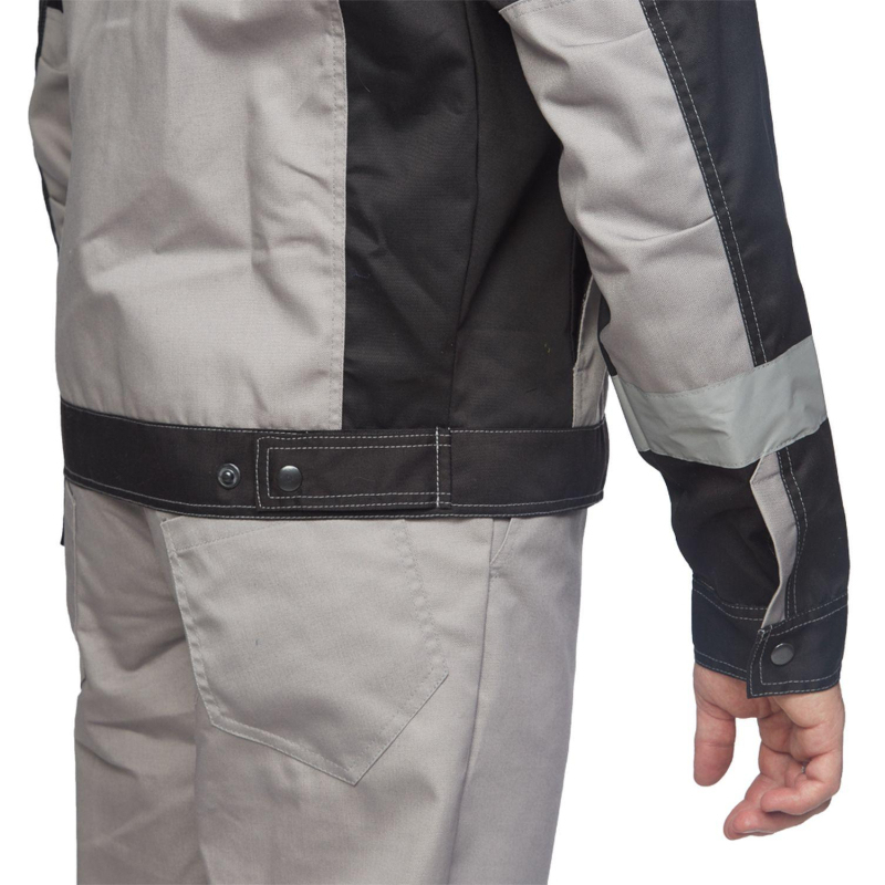 Костюм рабочий летний мужской л21-КБР с СОП серый/черный (размер 68-70, рост 194-200), состоит из куртки и брюк. Изготовлен из смесовой ткани (65% полиэстер, 35% хлопок) плотностью 240 г/кв.м. Светоотражающая полоса шириной 50 мм размещена на груди, спине, рукавах, а также внизу брюк. Куртка c застежкой на молнию и кнопки. На куртке два верхних накладных кармана. Рукава с налокотниками и манжетами. Ширина пояса куртки регулируется кнопками. Брюки прямого силуэта с застежкой на пуговицы. На передней половине брюк расположены два накладных кармана со скошенным входом. На брюках сзади 2 накладных кармана, один из которых на кнопке, а также боковой накладной карман на кнопке. Весь костюм сшит контрастными нитками белого цвета, двойной строчкой. Костюм предназначен для защиты от общих производственных загрязнений и механических воздействий. ГОСТ 12.4.280-2014, ТР ТС 019/2011. Сферы применения: сельское хозяйство, логистика, легкая промышленность, строительство, тяжелая промышленность. Коллекция рабочей одежды л21 представлена двумя видами комплектов: куртка и полукомбинезон л21-КПК, и куртка и брюки Л21-КБР. Законодательные и технические документы: