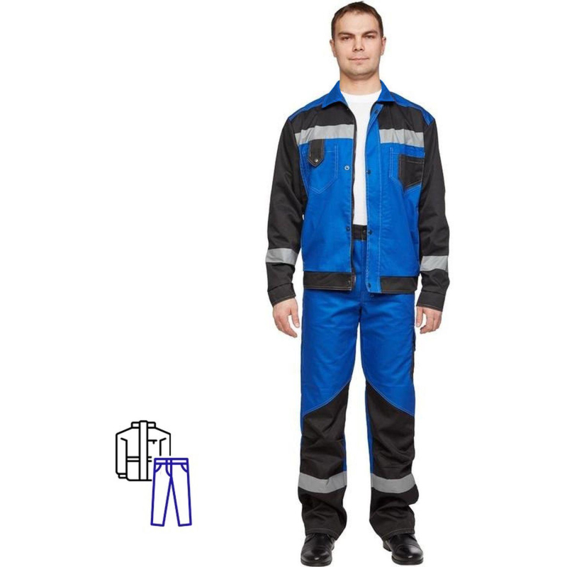 Костюм рабочий летний мужской л21-КБР с СОП васильковый/черный (размер 44-46, рост 158-164), состоит из куртки и брюк. Изготовлен из смесовой ткани (65% полиэстер, 35% хлопок) плотностью 240 г/кв.м. Светоотражающая полоса шириной 50 мм размещена на груди, спине, рукавах, а также внизу брюк. Куртка c застежкой на молнию и кнопки. На куртке два верхних накладных кармана. Рукава с налокотниками и манжетами. Ширина пояса куртки регулируется кнопками. Брюки прямого силуэта с застежкой на пуговицы. На передней половине брюк расположены два накладных кармана со скошенным входом. На брюках сзади 2 накладных кармана, один из которых на кнопке, а также боковой накладной карман на кнопке. Весь костюм сшит контрастными нитками белого цвета, двойной строчкой. Костюм предназначен для защиты от общих производственных загрязнений и механических воздействий. ГОСТ 12.4.280-2014, ТР ТС 019/2011. Сферы применения: сельское хозяйство, логистика, легкая промышленность, строительство, тяжелая промышленность. Коллекция рабочей одежды л21 представлена двумя видами комплектов: куртка и полукомбинезон л21-КПК, и куртка и брюки Л21-КБР. Законодательные и технические документы: