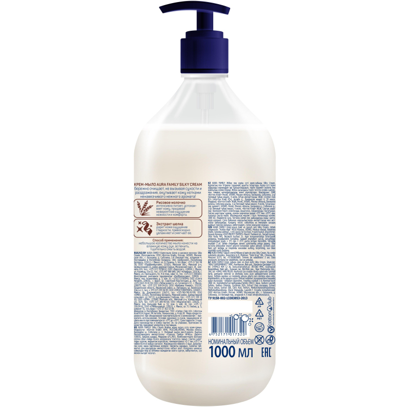 Крем-мыло Aura Silky Cream 1 л с экстрактами шелка и рисового молочка бережно очищает, не вызывая сухости и раздражения, окутывает кожу нотками ненавязчивого нежного аромата! Рисовое молочко интенсивно питает, успокаивает кожу, придавая невероятное ощущение нежности и комфорта. Экстракт шелка дарит коже ощущение гладкости, превосходно увлажняет и смягчает ее. Результат - кожа рук мягкая и сияющая как шелк! Крем-мыло Aura Silky Cream обязательно понравится взрослым и детям. А большой формат упаковки поможет сэкономить бюджет семьи. Назначение: для очищения кожи и ухода за ней. Способ применения: небольшое количество мыла нанести на влажную кожу рук, вспенить, тщательно смыть водой. Меры предосторожности: при обнаружении чувствительности к компонентам-прекратить использование. Состав: Aqua, Sodium Laureth Sulfate, Sodium Chloride, Cocamide DEA, Extract Olea europaea, Extract Oryza sativa, Extract Silk, Citric Acid, Parfum, Methylchloroisothiazolinone, Methylisothiazolinone, Glycol Distearate, Laureth-7. Условия хранения. Хранить в сухом, защищенном от света месте при температуре +5 °C до +25 °C. Срок годности: 36 месяцев с даты изготовления.