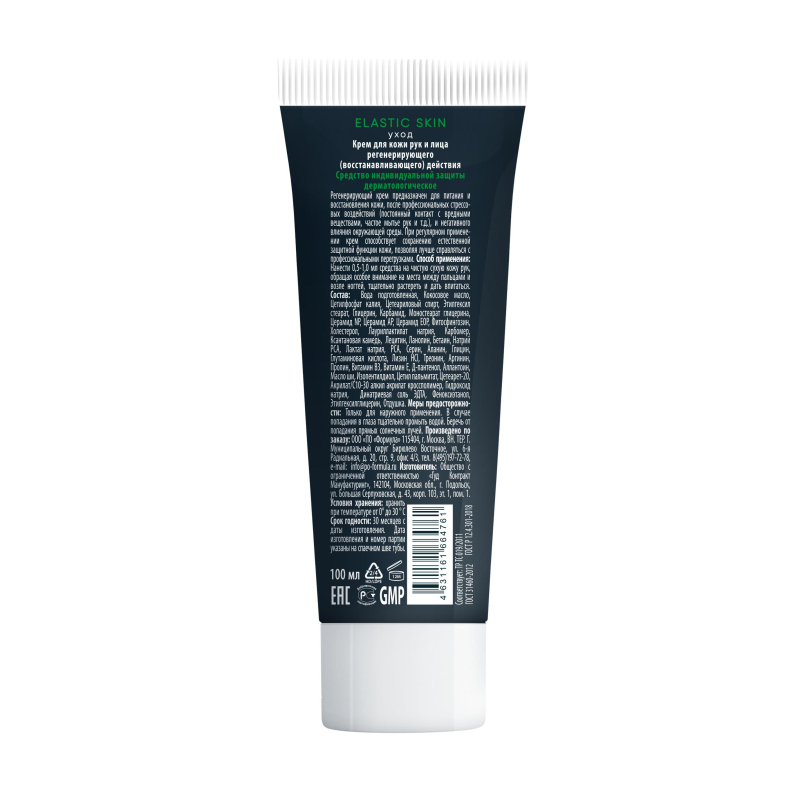 Крем ЭклИптика ELASTIC SKIN регенерирующий для рук 100 мл. Регенерирующий крем предназначен для питания и восстановления кожи, после профессиональных стрессовых воздействий, и негативного влияния окружающей среды. Создан на основе кокосового масла, содержит лецитин, который является антиоксидантом, и оказывает высокое воздействие на укрепление барьерных функций кожи. Содержит комплекс аминокислот, ланолин и сквалан усиливают липидный барьер кожи. Комплекс Витаминов (В3, В5, Е, С) питают и увлажняют кожу. Равномерно наносится, не оставляя ощущения липкости и жирного блеска. Подходит людям с чувствительной кожей. Содержит церамиды, они формируют структуру самого верхнего рогового слоя кожи и участвуют в образовании гидролипидной мантии. Состав: вода подготовленная, кокосовое масло, цетилфосфат калия, цетеариловый спирт, этилгексил стеарат, глицерин, карбамид, моностеарат глицерина, церамид NP, церамид АР, церамид ЕОР, фитосфингозин, холестерол, лауриллактилат натрия, карбомер, ксантановая камедь, лецитин, ланолин, бетаин, натрий РСА, лактат натрия, РСА, серин, аланин, глицин, глутаминовая кислота, лизин НCl, треонин, аргинин, пролин, витамин В3, витамин Е, Д-пантенол, аллантоин, масло ши, изопентилдиол, цетил пальмитат, цетеарет-20, акрилат/С10-30 алкил акрилат кроссполимер, гидроксид натрия, динатриевая соль ЭДТА, феноксиэтанол, этилгексилглицерин, отдушка. Способ применения: Нанести 0,5-1,0 мл средства на чистую сухую кожу рук, обращая особое внимание на места между пальцами и возле ногтей, тщательно растереть и дать впитаться. Упаковка: туба 100 мл. Условия хранения: от 0 до +30°C, избегать попадания прямых солнечных лучей. Срок годности от даты изготовления 30 месяцев, 12 месяцев с момента вскрытия. Соответствует стандартам: ТР ТС 019/2011, ГОСТ 31460-2012, ГОСТ Р 12.4.301-2018.