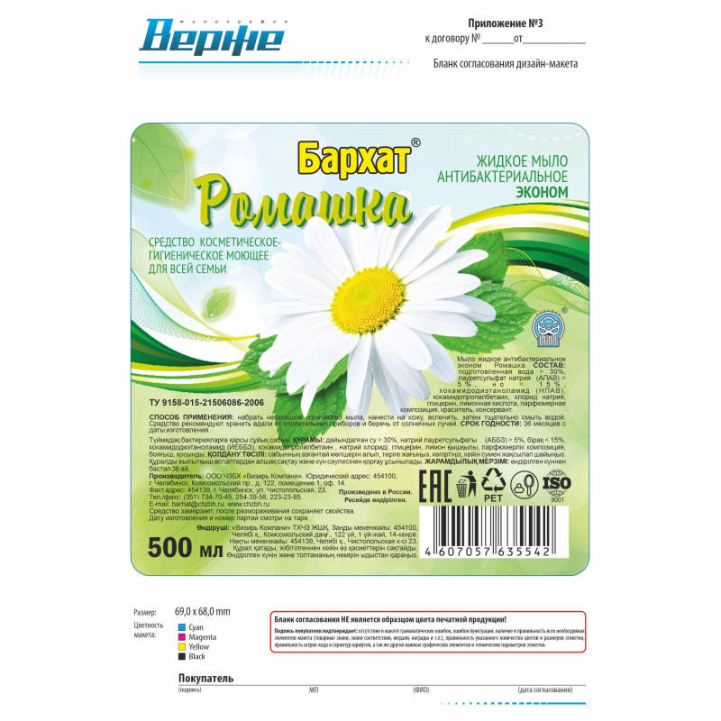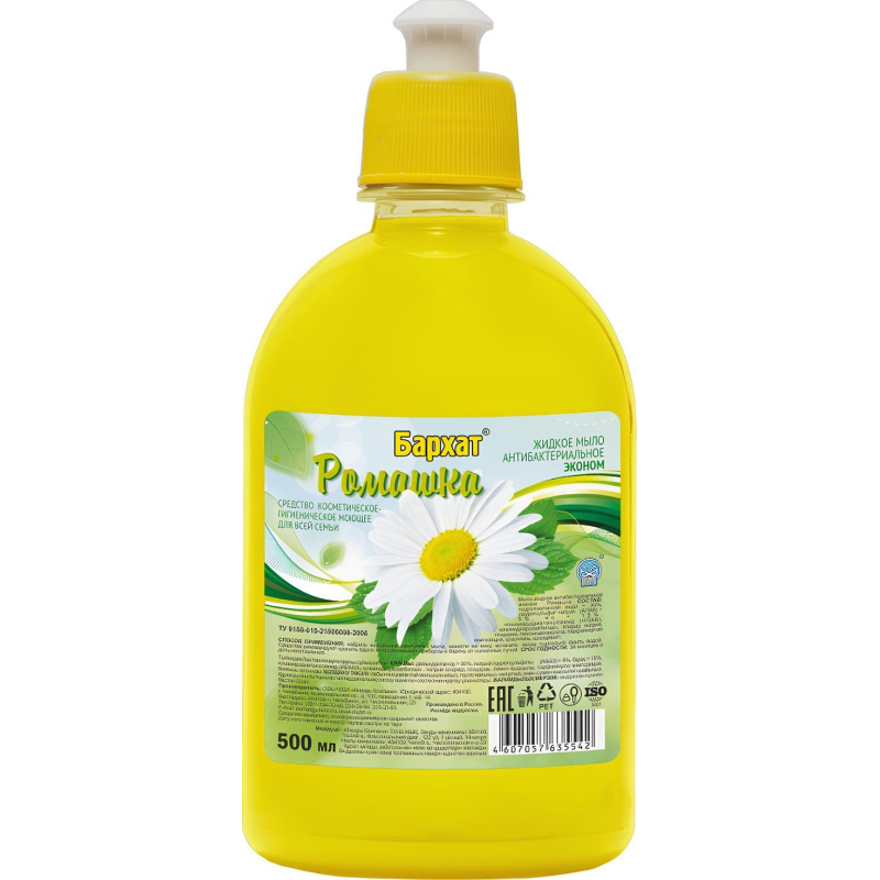 Мыло жидкое Бархат Ромашка 500 мл Назначение. Средство косметическое-гигиеническое моющее для всей семьи. Можно использовать для мытья рук, посуды и любых поверхностей на кухне. Способ применения. Набрать небольшое количество мыла, нанести на кожу, вспенить, затем тщательно смыть водой. Для хозяйственных нужд нанести на поверхность и смыть водой. Меры предосторожности. Беречь от детей! При попадании в глаза промыть большим количеством воды. Только для наружного применения. Состав: вода > 30%, лауретсульфат натрия > 5%, но менее 15%, кокамидодиэтаноламид < 5%, хлорид натрия < 5%, лимонная кислота, антимикробное вещество, парфюмерная композиция, цветовая добавка. Условия хранения. Средство рекомендуют хранить вдали от отопительных приборов и беречь от солнечных лучей. Средство замерзает, после размораживания сохраняет свои свойства. Срок годности: 36 месяцев.
