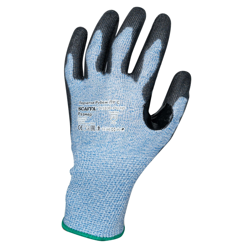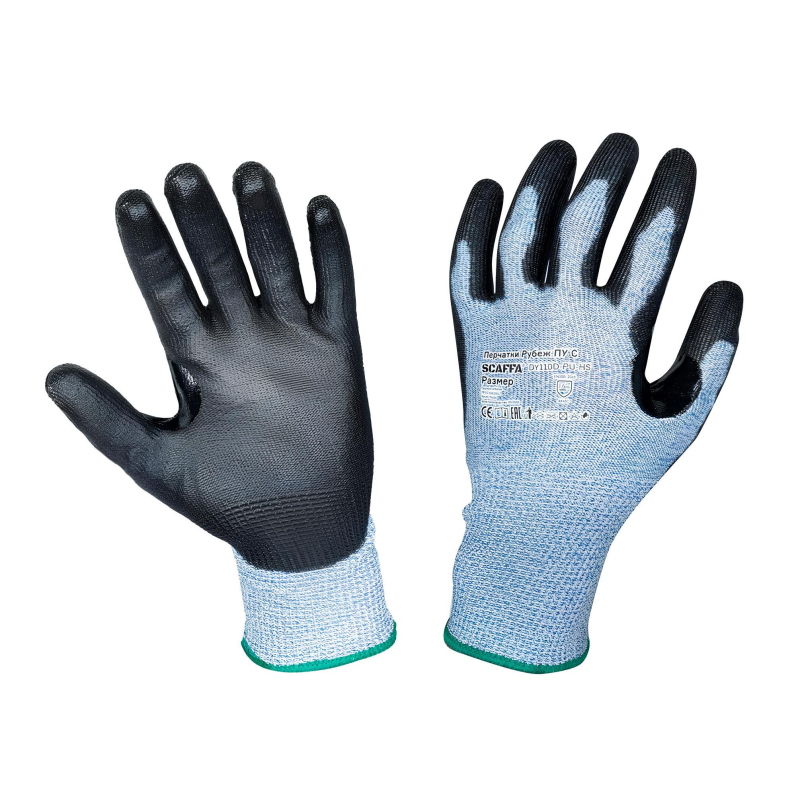 Перчатки для защиты от порезов Scaffa Рубеж с полиуретановым покрытием класс защиты C (10) (15 класс вязки, размер 11 (XXL)). Scaffa Рубеж ПУ С - качественные перчатки, которые защищают руки во время строительных и промышленных работ. Перчатка изготовлена из полиэтилена высокого давления и стекловолокна - их сочетание повышает сопротивляемость изделия к порезам и проколам. Бесшовная основа из нейлона не натирает кожу и не снижает ее чувствительность. Защитное покрытие изготовлено из плотного полиуретана - оно покрывает ладонь и напалки с тыльной стороны, между большим и указательным пальцами есть усиление. Материал обеспечивает крепкий захват как сухих, так и влажных поверхностей. Удлиненный манжет защищает запястье и предотвращает попадание внутрь мусора и вредных веществ. Цвет напульсника определяет размер изделия. Перчатки комфортно носить много часов подряд. Они подходят для: - использования при строительных работах; - работы с режущим инструментом, стеклом или металлическими деталями с острыми, неровными краями. Защитные свойства перчатки соответствуют стандарту EN388: 2016 - 4Х43С: - стойкость к истиранию: 4 уровень. Материал выдерживает не менее 8000 циклов истирания, прежде чем начнет изнашиваться; - стойкость к разрыву: 4 уровень. Перчатка выдерживает нагрузку в 75 Н без разрыва; - стойкость к проколу: 3 уровень. Материал выдерживает нагрузку в 100 Н без прокола; - стойкость к порезу: уровень С. Перчатка выдерживает нагрузку в 10 Н без пореза. Уровень С -средний уровень стойкости к порезу. Перчатка соответствует стандартам: - ТР ТС 019/2011; - ГОСТ 12.4.252-2013; - ГОСТ 12.4.183-91. Длина изделия - 260 мм, размер 11, в упаковке 1 пара.