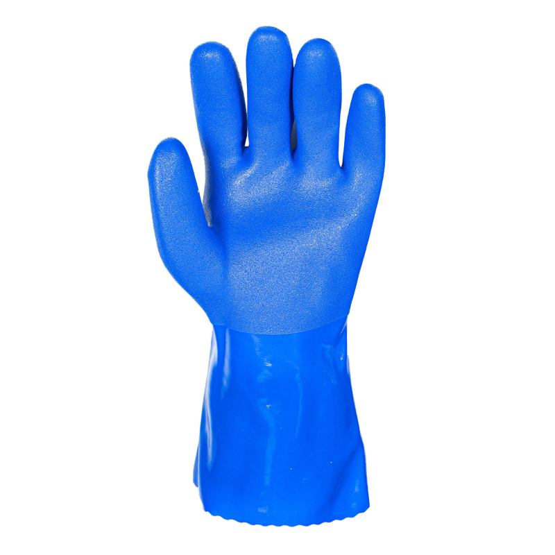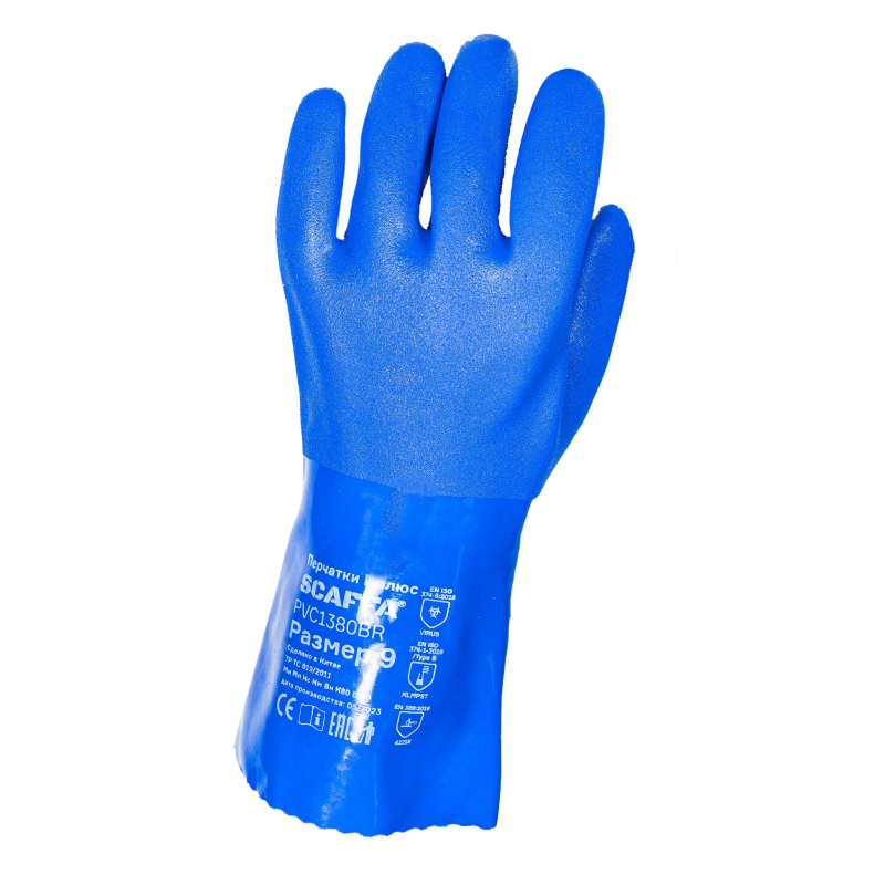 Перчатки рабочие от нефти и нефтепродуктов, от кислот и щелочей Scaffa Полюс хлопковые с ПВХ покрытием синие (размер 9 (L)). Scaffa Полюс - прочные перчатки анатомической формы, предназначенные для защиты рук от пониженных температур. Основа перчатки изготовлена из трикотажной основы интерлок с полным покрытием ПВХ (тройной облив). Перчатки имеют высокую гибкость, остаются эластичными при работе в условиях низких температур или холодной воде. Не снижаю чувствительность рук, маслобензостойкие. Фактурное покрытие обеспечивает надежный захват, а манжет обеспечивает герметичность изделия для вредных веществ. Перчатки рекомендованы к использованию: - в нефтехимической отрасли; - при добыче и переработке нефтепродуктов; - в пищевой промышленности; - в рыболовной отрасли; - в коммунальном хозяйстве; - в бытовых целях. Защитные свойства соответствуют стандарту EN388: 2016 - 4221X: - стойкость к истиранию: 4 уровень. Материал выдерживает не менее 8000 циклов истирания, прежде чем начнет изнашиваться; - стойкость к разрыву: 2 уровень. Перчатка выдерживает нагрузку в 25 Н без разрыва; - стойкость к порезу: уровень 2, индекс стойкости: не менее 2,5 (стойкость по EN ISO13997 - уровень B); - стойкость к проколу: уровень 1 (не менее 20 Н). Класс стойкости к проникновению: не менее 2 (время проникновения: более 30 мин). По стандарту EN ISO 374-1:2016 имеет уровень защиты B / KLMPST, где: - К - защита от 40% гидроксида натрия; - L - защита от 96% серной кислоты; - М - защита от 65% азотной кислоты; - P - защита от 30% пероксида водорода; - S - защита от 40% фтороводородной кислоты; - T- защита от 37% формальдегида. Соответствует стандартам: - ГОСТ ISO 374-5-2016 - VIRUS; - ТР ТС 019/2011; - ГОСТ 12.4.103-2020; - ГОСТ 12.4.252-2013; - ГОСТ 12.4.183-91. Соответствует уровням защиты К80Щ50, Ми, Мп, Нм, Нс, Вн: - К80 - защищает от кислот с концентрацией не более 80%; - Щ50 - защищает от растворов щелочей концентрации выше 20% (по гидроокиси натрия - 50%); - Ми - защищает от механических воздействий (истирания); - Мп - защищает от проколов и порезов; - Нм - защищает от продуктов тяжелых фракций и нефтяных масел; - Нс - защищает от сырой нефти; - Вн - непроницаема для воды. Длина изделия - 300 мм, размер 9, в упаковке 1 пара.