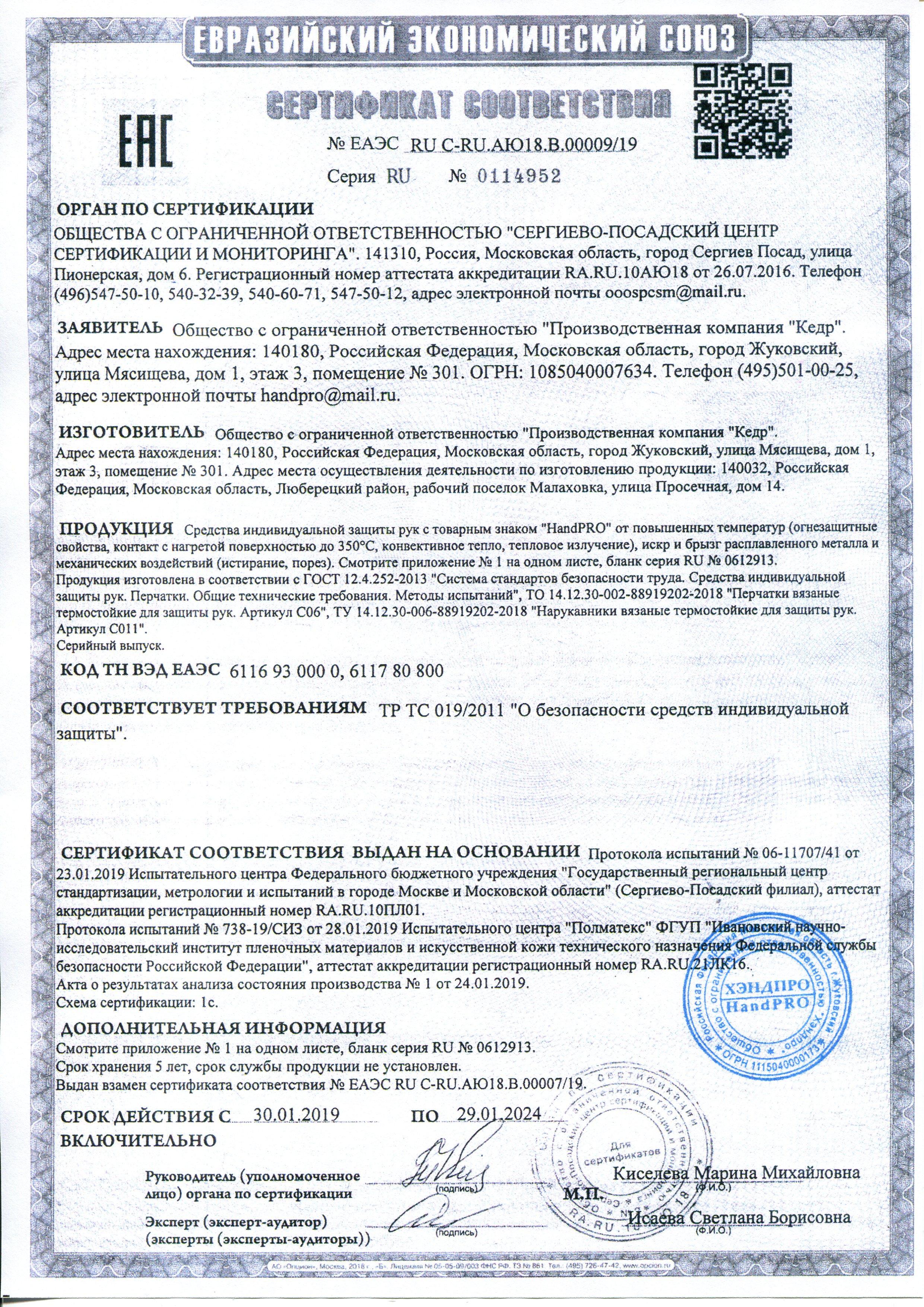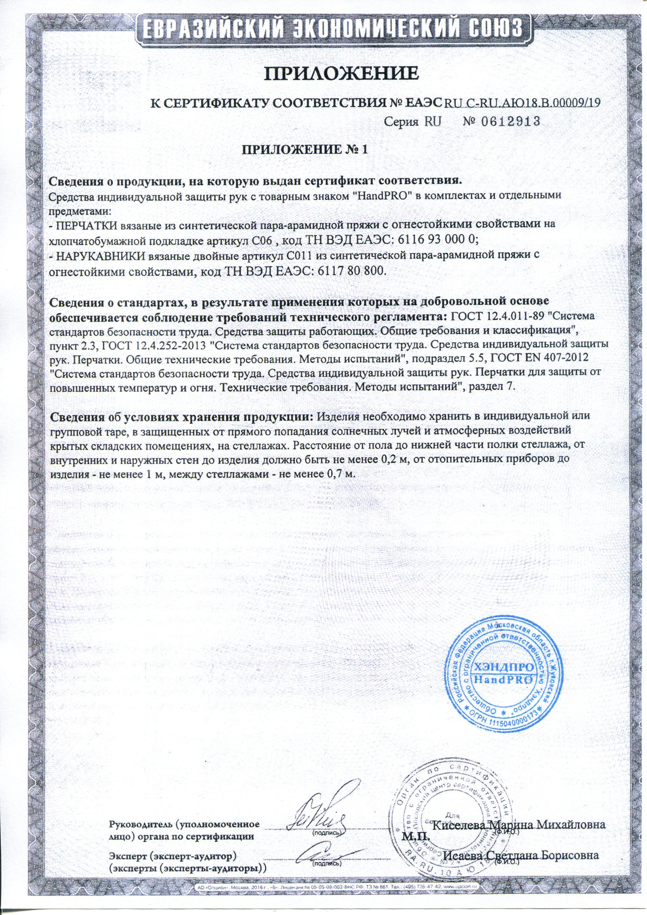 Перчатки с внутренней х/б подкладкой. Идеально защищают от ожогов, подходят для работы с раскалёнными и острыми предметами. Максимально устойчивы к порезам. Не выделяют при нагреве вредных для человека веществ. Перчатки предназначены для работы в металлургической и стекольной промышленностях, на производстве шин и при сварочных работах. Материал: Высокоэффективное теплостойкое волокно Kevlar, в 5 раз прочнее стали на разрыв; сопротивление на разрез в 8 раз выше, чем у кожи. Размер: универсальный. Перчатки гигиеничны, можно неоднократно обрабатывать моющими средствами. Комфортная работа по показателю термостойкость (контакт) до 300 С-5 секунд, соответствует ТР ТС 019/2011. Устойчивость к порезам: 4. Стойкость к прожиганию — 60 секунд.