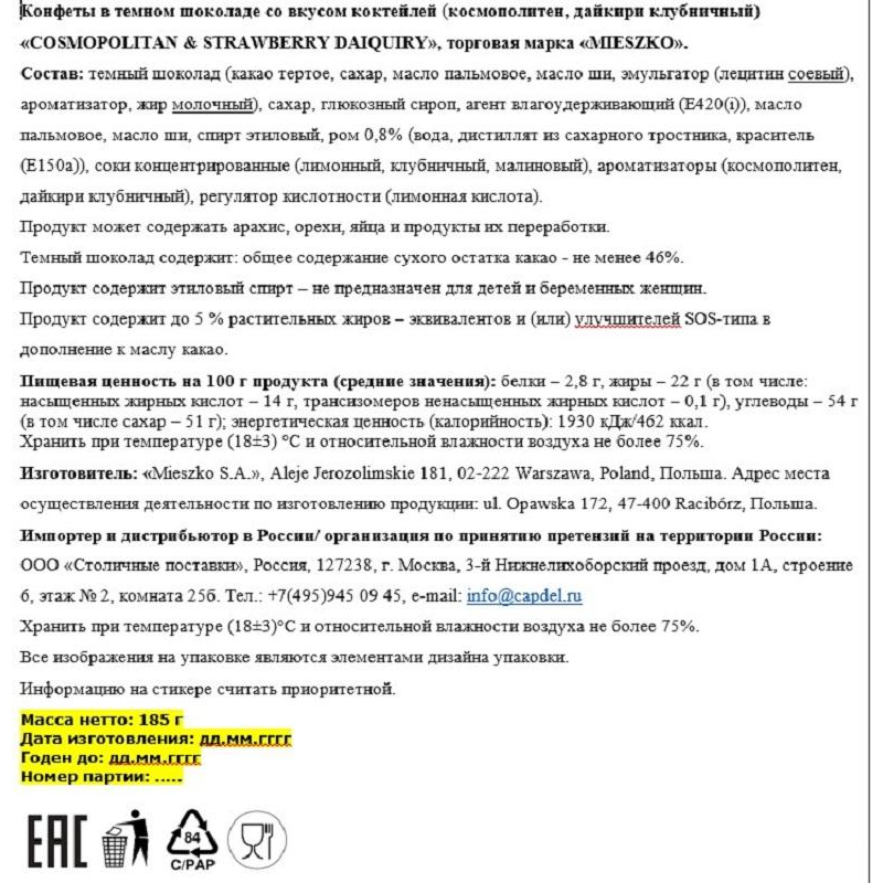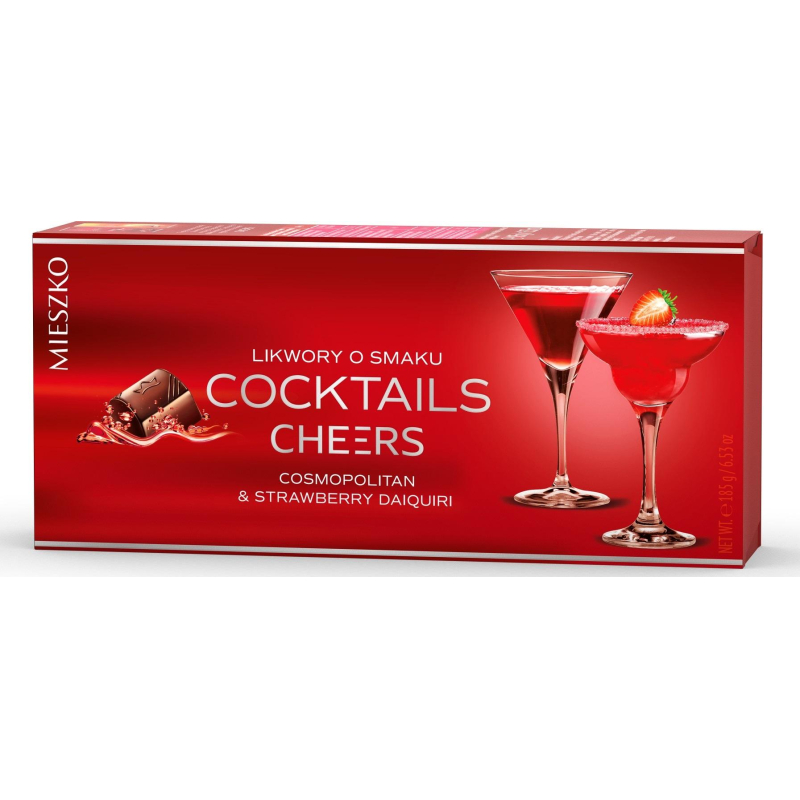 Набор ликерных конфет со вкусом коктейлей космополитен и дайкири (клубничный). Не содержит ГМО, Компания Mieszko является бесспорным лидером рынка вишни в Польше, создает для своих клиентов новые вкусы. Вес: 185 г. Состав: темный шоколад (какао тертое, сахар, масло пальмовое, масло ши, эмульгатор (лецитин соевый), ароматизатор, жир молочный), сахар, глюкозный сироп, агент влагоудерживающий (Е420(i)), масло пальмовое, масло ши, спирт этиловый, ром 0,8% (вода, дистиллят из сахарного тростника, краситель (Е150а)), соки концентрированные (лимонный, клубничный, малиновый), ароматизаторы (космополитен, дайкири клубничный), регулятор кислотности (лимонная кислота). Продукт может содержать арахис, орехи, яйца и продукты их переработки. Темный шоколад содержит: общее содержание сухого остатка какао - не менее 46%. Продукт содержит этиловый спирт - не предназначен для детей и беременных женщин. Пищевая ценность на 100 г продукта (средние значения): белки - 2.8 г, жиры - 22 г (в том числе: насыщенных жирных кислот - 14 г, трансизомеров ненасыщенных жирных кислот - 0.1 г), углеводы - 54 г (в том числе сахар - 51 г). Энергетическая ценность (калорийность): 1930 кДж/462 ккал. Срок годности: 12 месяцев. Условия хранения: хранить при температуре 18 °C и относительной влажности воздуха не более 75%. Производитель: Mieszko. Страна производства: Польша.