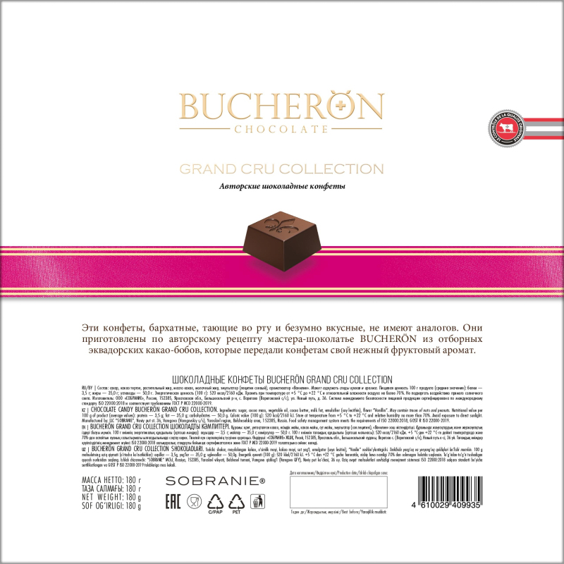 Конфеты шоколадные Bucheron Grand Cru Collection с какао 180 г. Эти конфеты, бархатные, тающие во рту и безумно вкусные, не имеют аналогов. Они приготовлены по авторскому рецепту мастера-шоколатье Bucheron из отборных эквадорских какао-бобов, которые передали конфетам свой нежный фруктовый аромат. Вес: 180 г. Состав: сахар, какао тертое, растительный жир, какао-порошок, масло какао, молочный жир, сухая молочная сыворотка, эмульгатор (лецитин соевый, Е476), ароматизатор "Ванилин". Может содержать следы орехов и арахиса. Пищевая ценность на 100 г продукта (средние значения): белки - 4 г; жиры - 36 г; углеводы - 52 г. Энергетическая ценность на 100 г продукта (калорийность): 540 ккал/2250 кДж. Срок годности: 18 месяцев. Условия хранения: хранить при температуре от +5 °C до +22 °C и относительной влажности воздуха не более 70%. Не подвергать воздействию прямого солнечного света. Производитель: ООО "Собрание". Страна производства: Россия. ГОСТ Р ИСО 22000-2019.
