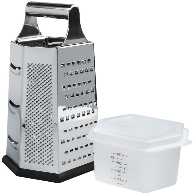 ?Терка TalleR 1??0??5??x??1??3??0 мм (TR-21906) с контейнером.??Размеры: высота ??-?? 22.9 см, основание 10.5??x??13 см.??Большая площадь рабочей поверхности.??6 лезвий: крупная терка, средняя терка, мелкая терка, шинковка, фигурная шинковка, шредер.??Силиконовый протектор на терке предотвращает скольжение по поверхности. Съемный контейнер с крышкой обеспечивает порядок на рабочем пространстве и предохраняет продукты от обветривания. Специальная форма контейнера позволяет легко убирать его внутрь основания. Можно мыть в посудомоечной машине.?