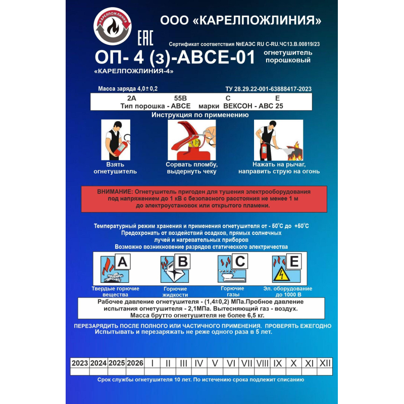 Огнетушитель порошковый КАРЕЛПОЖЛИНИЯ ОП-4(з) (АВСЕ, 2А 55В СЕ, ЗПУ-латунь). Огнетушитель порошковый ОП-4(з) ABCE-01 "КАРЕЛПОЖЛИНИЯ-4" (2А 55В С Е) закачной. Эффективен при тушении твердых веществ, горючих жидкостей и газов, и электрооборудования под напряжением до 1000 В. Рекомендуется использовать при температуре от -50 до +50 °C. Предназначен для защиты общественных, производственных, складских и жилых зданий и помещений. Применяется также на грузовых автомобилях и автобусах. Эффективен при тушении твердых веществ, горючих жидкостей и газов, электрооборудования под напряжением до 1000 В. Рекомендуется использовать при температуре от -50 до +50 °C. Огнетушитель способен подавать струю огнетушащего состава на расстояние не менее 3-х метров. Торговая марка - "КАРЕЛПОЖЛИНИЯ". Тип огнетушителя - порошковый. Модель - ОП-4. Запорно-пусковое устройство - материал латунь. Ранг модельного очага пожара - 2А 55В СЕ. Сегмент - стандарт. Производитель огнетушащего вещества (ОТВ) - ЗАО "Экохиммаш". Класс пожара A - твердые вещества, B - горючие жидкости, C - горючие газы, E - электрооборудование под напряжением до 1000 В. Масса заряда - 4 кг. Вес - 6,5 кг. Продолжительность подачи огнетушащего вещества - 10 сек. Огнетушащая способность (площадь) - 9,36 кв.м. Перезаряжаемый - да. Автомобильный - да. Длина струи огнетушащего вещества (не менее) 3 м. Диаметр корпуса огнетушителя - 133 мм. Высота - 420 мм. Условия эксплуатации - от -50 до +50 °С. Стандарты - ГОСТ Р51057-2001. Сертификат соответствия ЕАЭС - да. Сертификационный орган - "Пожтест" ФГБУ ВНИИПО МЧС России. Количество штук в упаковке - 1. Гарантийный срок - 24 мес. Срок службы огнетушителя - 10 лет. Количество единиц продаж в транспортной упаковке - 1. Страна происхождения - Российская Федерация. Комплектация: шланг-распылитель, паспорт.