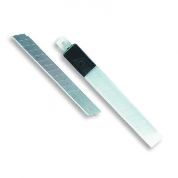 Запасные лезвия Attache для канцелярского ножа изготовлены из стали, ширина — 9 мм. Имеют метки для точного обламывания, нанесенные с помощью лазерной гравировки. Поставляются набором из 10 штук в пластиковом футляре.