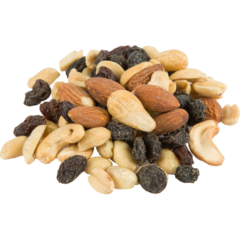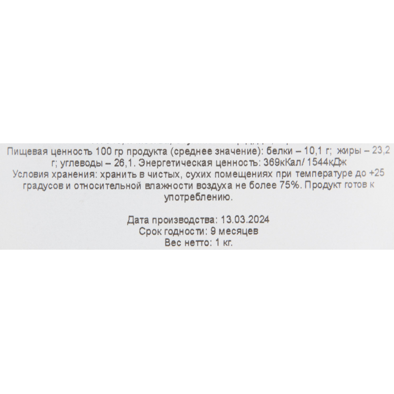 Смесь жареных орехов и изюма- один из самых востребованных продуктов. Сочетание жареных орехов со сладким изюмом не только вкусно, но и полезно. Употребляя смесь в качестве перекуса, можно зарядиться энергией на долгое время. Ореховые смеси добавляют в каши, йогурты, мюсли, гранолу. Такую смесь часто едят спортсмены: она восполняет запас физических сил и тонизирует. Благодаря высокому содержанию протеинов в орехах этот перекус препятствует потере мышечной массы. Состав: ядра орехов жареных (кешью, арахис, миндаль), изюм темный. Пищевая ценность 100 гр продукта (среднее значение): белки - 10,1 г; жиры - 23,2 г; углеводы - 26,1 г. Энергетическая ценность: 369 ккал/ 1544 кДж. Срок годности: 9 месяцев. Условия хранения: хранить в чистых, сухих помещениях при температуре до +25 градусов и относительной влажности воздуха не более 75%. Продукт готов к употреблению. Вес: 1 кг. Страна производства: Россия.
