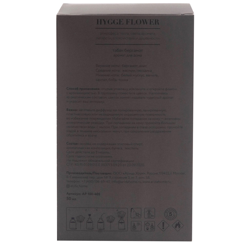 Одной из важных составляющих уюта в доме считается аромат. Ароматический диффузор - это самый простой, изящный, эффективный и долговременный способ ароматизации пространства, набирающий свою популярность во всем мире день ото дня. Ноты аромата: верхние ноты: бергамот, анис; средние ноты: жасмин, гвоздика; нижние ноты: белый мускус, ваниль. Состав: основа не содержащая этиловый спирт, ароматическая композиция, бумага, текстиль. Объем: 50 мл. Упаковка: картонная коробка и термоусадочная пленка. Срок действия: до 5 недель. Срок годности: не ограничен. Способ применения: открыв упаковку, извлеките бутылочку и вставьте цветок. Определите ровную, недоступную для детей и питомцев поверхность, где будет стоять диффузор. Запах будет распространиться по комнате, создавая ненавязчивый фоновый аромат.