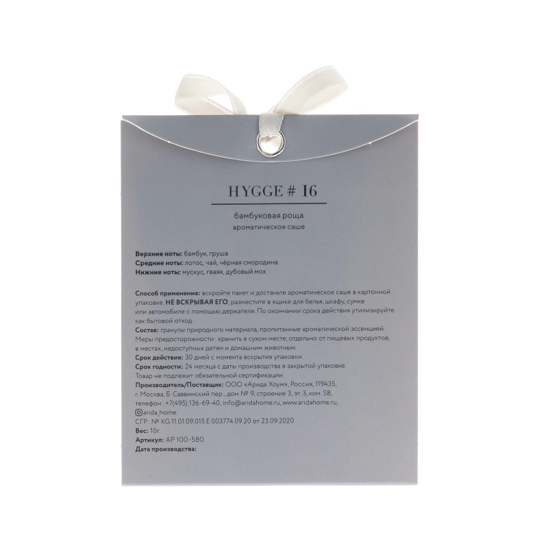 Верхние ноты: бамбук, груша. Средние ноты: лотос, чай, черная смородина. Нижние ноты: мускус, гваяк, дубовый мох. Состав: гранулы природного материала, пропитанные ароматической эссенцией. Упаковка: прозрачный целлофановый пакетик с европодвесом. Поставляется в промобоксе по 24 шт. Срок действия: 30 дней с момента вскрытия упаковки. Срок годности: 24 месяца с даты производства в закрытой упаковке.