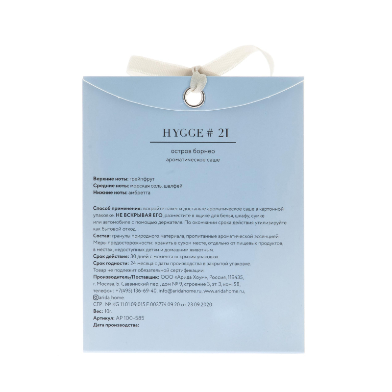 Верхние ноты: грейпфрут. Средние ноты: морская соль, шалфей. Нижние ноты: амбретта. Состав: гранулы природного материала, пропитанные ароматической эссенцией. Упаковка: прозрачный целлофановый пакетик с европодвесом. Поставляется в промобоксе по 24 шт. Срок действия: 30 дней с момента вскрытия упаковки. Срок годности: 24 месяца с даты производства в закрытой упаковке.
