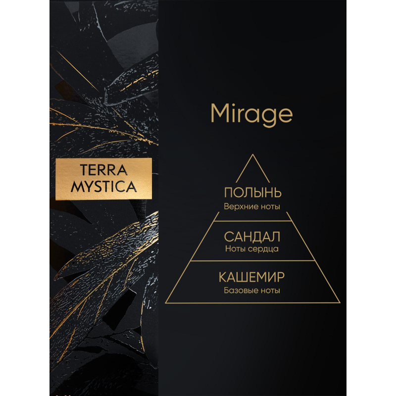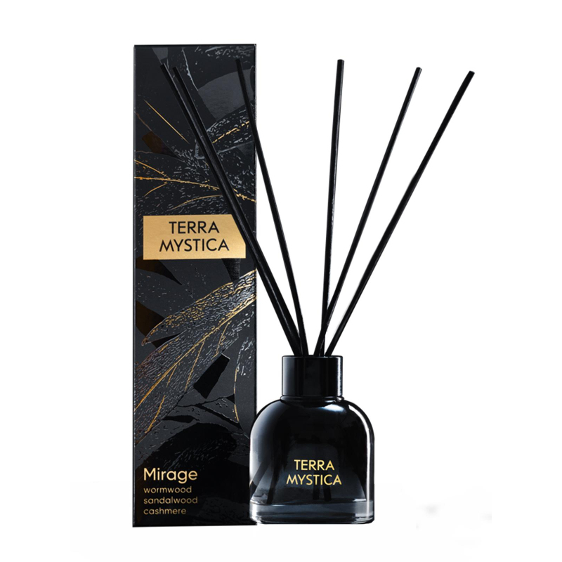 Ароматические диффузоры Terra Mystica - это премиальная коллекция ароматов для дома от ведущих европейских парфюмеров. Изысканные, загадочные, роскошные композиции для истинных ценителей высокого качества жизни. Уютная композиция на основе мягчайшего кашемира, теплых смолистых нот сандала и зеленого аккорда полыни укажет дорогу в мираж (Mirage), который с приближением будет становиться только реальнее. Флаконы в дымчатом градиентном прокрасе и элегантные палочки глубокого черного цвета откроют путь к эксклюзивной парфюмерной композиции 'Mirage'. Стильная черная упаковка с золотыми растительными принтами выглядит роскошно и безошибочно укажет путь к мистической философии ароматов. Используя разное количество палочек можно удобно регулировать интенсивность аромата в помещении: чем больше палочек вставлено в диффузор, тем сильнее и насыщеннее распространяется аромат. Стойкость аромата до 6 недель, в зависимости от помещения и интенсивности использования. Коллекция парфюмов для дома Terra Mystica погрузить в атмосферу роскоши, уюта и станет завершающим элементом, которого так не хватало для создания идеальной картины в интерьере. Подчеркните вашу индивидуальность вместе с ароматическими диффузорами Terra Mystica.