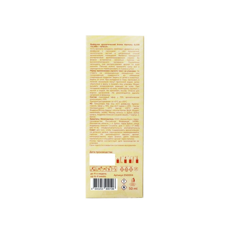 Диффузор ароматический Arona Harmony "Блеск". Ноты аромата: мандарин, грейпфрут, древесные ноты Диффузор с палочками - это безопасный, экологически чистый и натуральный способ ароматизации помещения. Является прекрасной альтернативой ароматизированным спреям. Во флакон вставляются несколько палочек из высококапиллярного материала. Постепенно насыщаясь, они распространяют аромат по всей комнате. Палочки можно применять сразу все и периодически переворачивать (1-2 раза в сутки). Перед применением изучите текст на упаковке. Не ставить на незащищенную окрашенную или полированную поверхность, во избежание повреждения покрытия. Беречь от детей и животных. Беречь от огня. Не принимать внутрь. При попадании в глаза промывать в течение нескольких минут проточной водой. Затем обратиться к врачу и показать ему этикетку. Может вызывать аллергическую реакцию на коже. При попадании жидкости на кожу необходимо промыть с мылом и водой. Не принимать внутрь. Опасно для водных организмов. Не рекомендуется вдыхать напрямую из флакона. Состав: гликолевый эфир 70%, ароматическая композиция 20 %. Объем: 50 мл. Совет: для того, чтобы поддерживать уровень ароматизации на должном уровне, периодически переворачивайте палочки. Не рекомендуется вдыхать аромат непосредственно через флакон, дайте палочкам пропитаться и 'слушайте' аромат через палочки. Номер партии соответствует дате производства на упаковке. Срок годности в закрытом состоянии неограничен.