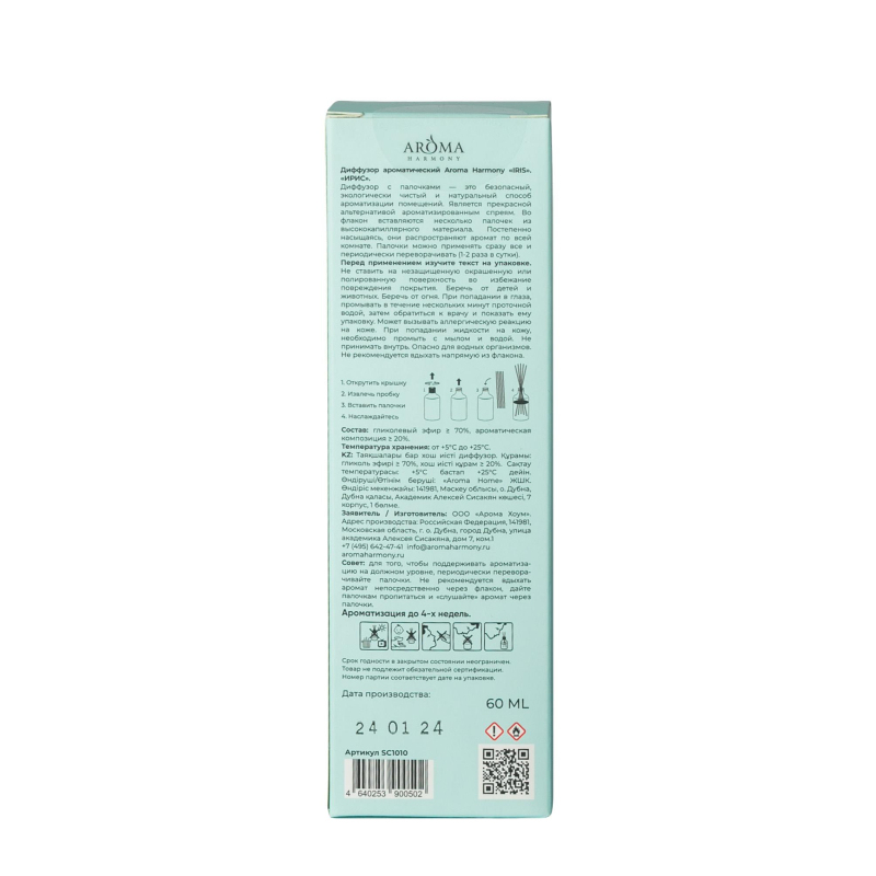 Закройте глаза и представьте себе прекрасные цветочные поля, где каждый аромат раскрывает свою уникальную силу и красоту. Iris восхитит вас своей глубиной и элегантностью, в основе которой легли ноты ириса, розового перца, ириса, граната, сливы и амбры. Диффузор ароматический Arona Harmony "Iris". "Ирис". Ноты аромата: розовый перец, ирис, гранат, слива, амбра Диффузор с палочками - это безопасный, экологически чистый и натуральный способ ароматизации помещения. Является прекрасной альтернативой ароматизированным спреям. Во флакон вставляются несколько палочек из высококапиллярного материала. Постепенно насыщаясь, они распространяют аромат по всей комнате. Палочки можно применять сразу все и периодически переворачивать (1-2 раза в сутки). Перед применением изучите текст на упаковке. Не ставить на незащищенную окрашенную или полированную поверхность, во избежание повреждения покрытия. Беречь от детей и животных. Беречь от огня. Не принимать внутрь. При попадании в глаза промывать в течение нескольких минут проточной водой. Затем обратиться к врачу и показать ему этикетку. Может вызывать аллергическую реакцию на коже. При попадании жидкости на кожу необходимо промыть с мылом и водой. Не принимать внутрь. Опасно для водных организмов. Не рекомендуется вдыхать напрямую из флакона. Состав: гликолевый эфир 70%, ароматическая композиция 20% Температура хранения: от +5С до +25С. Объем: 60 мл. Совет: для того, чтобы поддерживать уровень ароматизации на должном уровне, периодически переворачивайте палочки. Не рекомендуется вдыхать аромат непосредственно через флакон, дайте палочкам пропитаться и ?слушайте? аромат через палочки. Номер партии соответствует дате производства на упаковке. Срок годности в закрытом состоянии неограничен. Товар не подлежит обязательной сертификации.