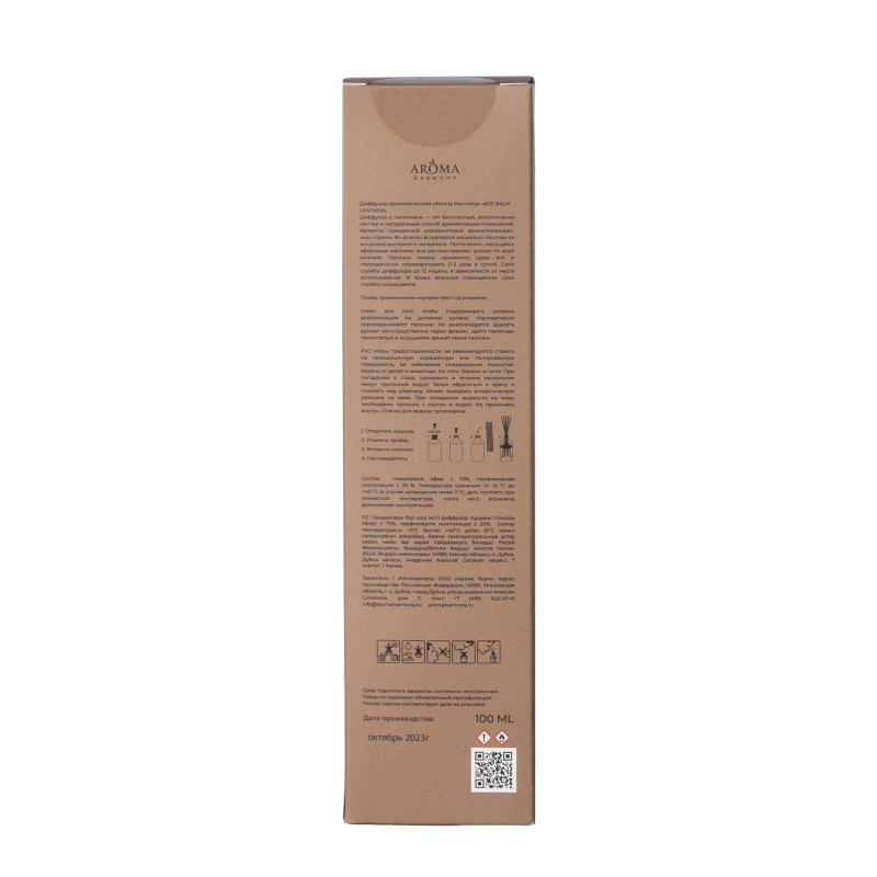 Диффузор ароматический Arona Harmony "Balm Leather". Ноты аромата: Кожа, тубероза, виски. Диффузор с палочками - это безопасный, экологически чистый и натуральный способ ароматизации помещения. Является прекрасной альтернативой ароматизированным спреям. Во флакон вставляются несколько палочек из высококапиллярного материала. Постепенно насыщаясь, они распространяют аромат по всей комнате. Палочки можно применять сразу все и периодически переворачивать (1-2 раза в сутки). Перед применением изучите текст на упаковке. Не ставить на незащищенную окрашенную или полированную поверхность, во избежание повреждения покрытия. Беречь от детей и животных. Беречь от огня. Не принимать внутрь. При попадании в глаза промывать в течение нескольких минут проточной водой. Затем обратиться к врачу и показать ему этикетку. Может вызывать аллергическую реакцию на коже. При попадании жидкости на кожу необходимо промыть с мылом и водой. Не принимать внутрь. Опасно для водных организмов. Не рекомендуется вдыхать напрямую из флакона. Состав: гликолевый эфир 70%, ароматическая композиция 20 %. Температура хранения: от +5С до +25 С. Объем: 100 мл. Совет: для того, чтобы поддерживать уровень ароматизации на должном уровне, периодически переворачивайте палочки. Не рекомендуется вдыхать аромат непосредственно через флакон, дайте палочкам пропитаться и 'слушайте' аромат через палочки. Номер партии соответствует дате производства на упаковке. Срок годности в закрытом состоянии неограничен. Товар не подлежит обязательной сертификации.